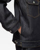 細節配置延續高端設定,包括黑色壓紋皮革皮標、緹花口袋布、黑化銅鉚釘、隱藏式後口袋鉚釘、金屬拉鍊,以及象徵岡山丹寧血統的粉紅色布邊 ID。