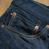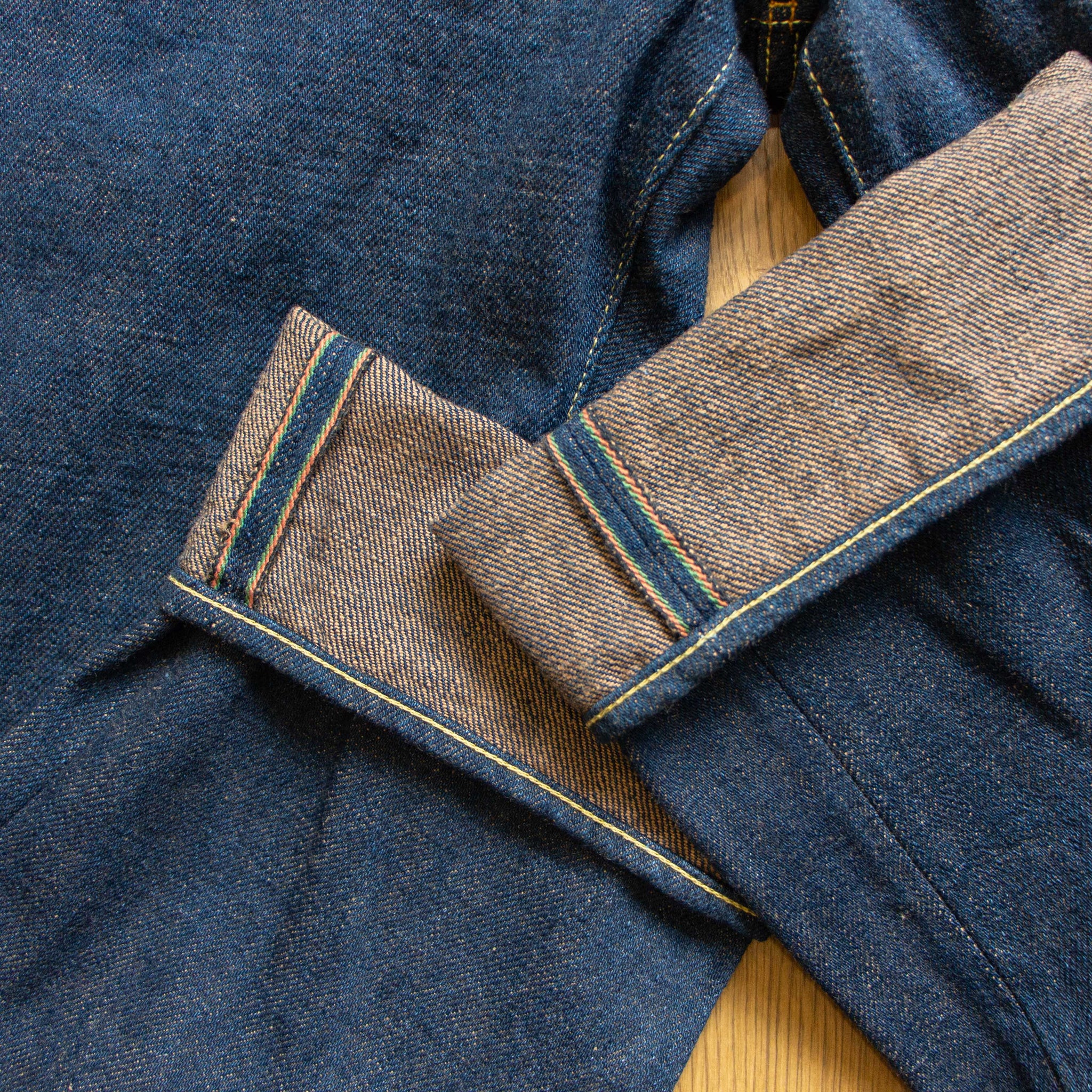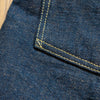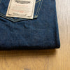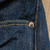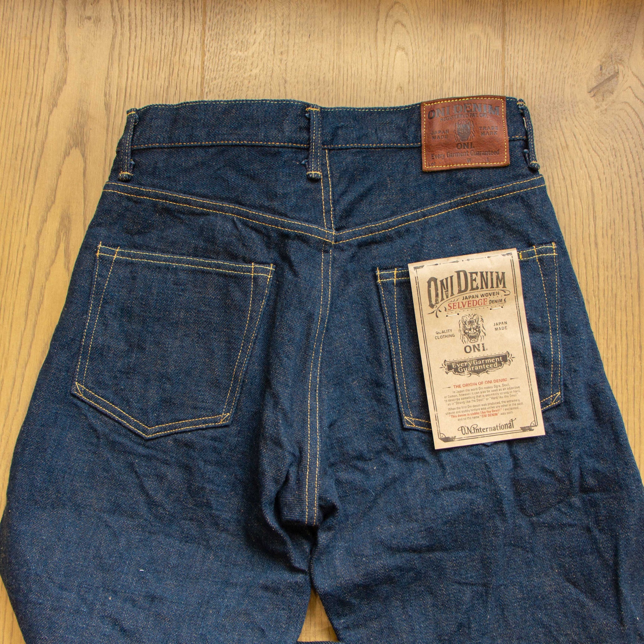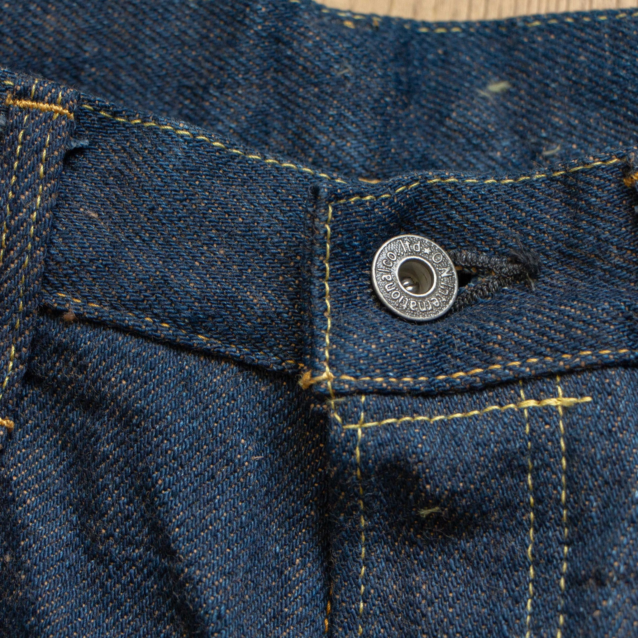 古董Levi’s所使用的紗線號數為6x7號線,這是典型的復古牛仔褲會使用的紗線配置,而ONI大膽地使用了3.7x3.7的極粗紗,原料的選用上混和了三種不同的棉花,在老式織布機上以ONI擅長的超級低張力進行織布,成品手感既厚而不像紙板,既粗糙佈滿毛感而不至於令人退卻,ONI為了達到特殊的布面藍色色調,對於每一塊布料的緯紗都會進行特殊調色,為達到「鬼秘」獨特的藍色澤,內面特意染色為米白色紗,質感溫潤並且上腳之後完全不咬腳。(或是說咬腿?)