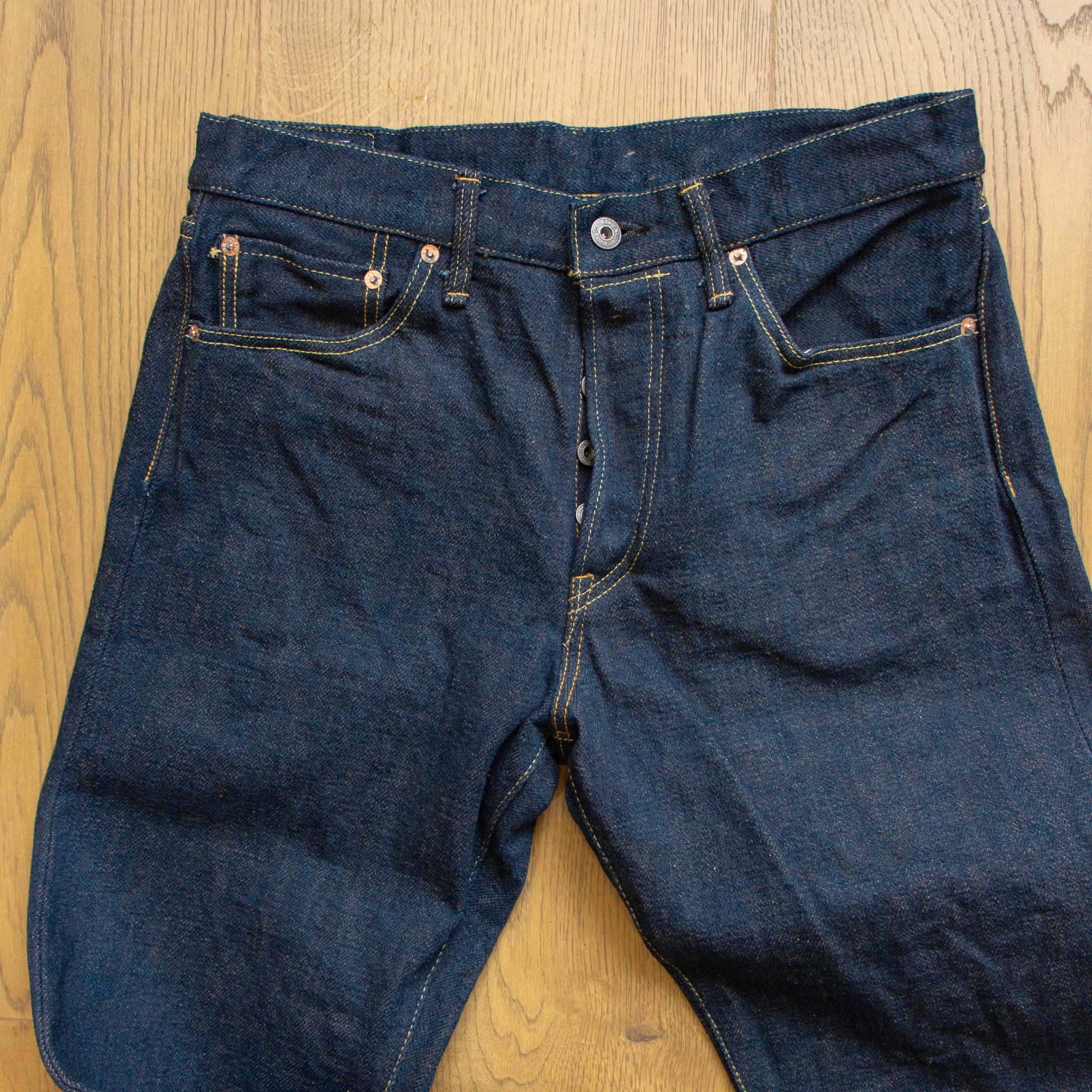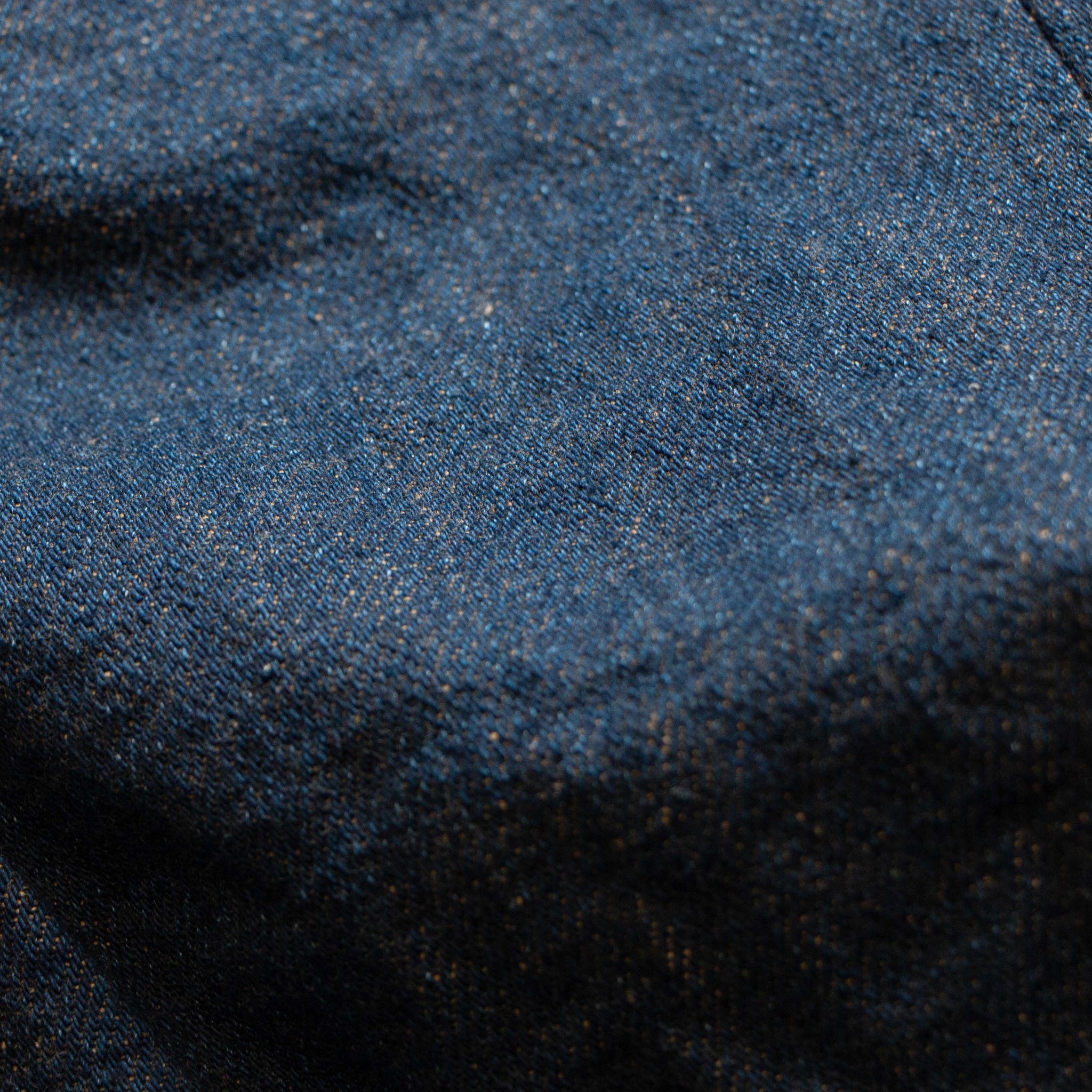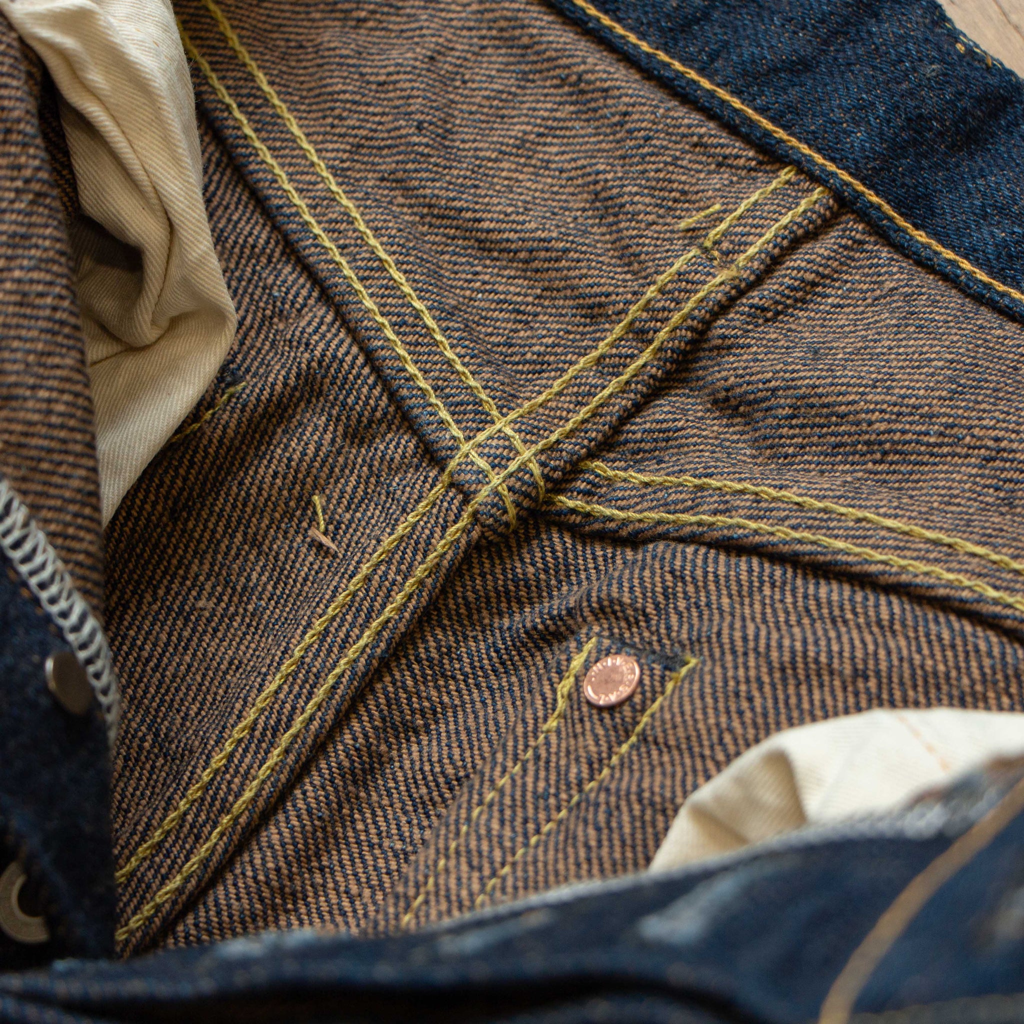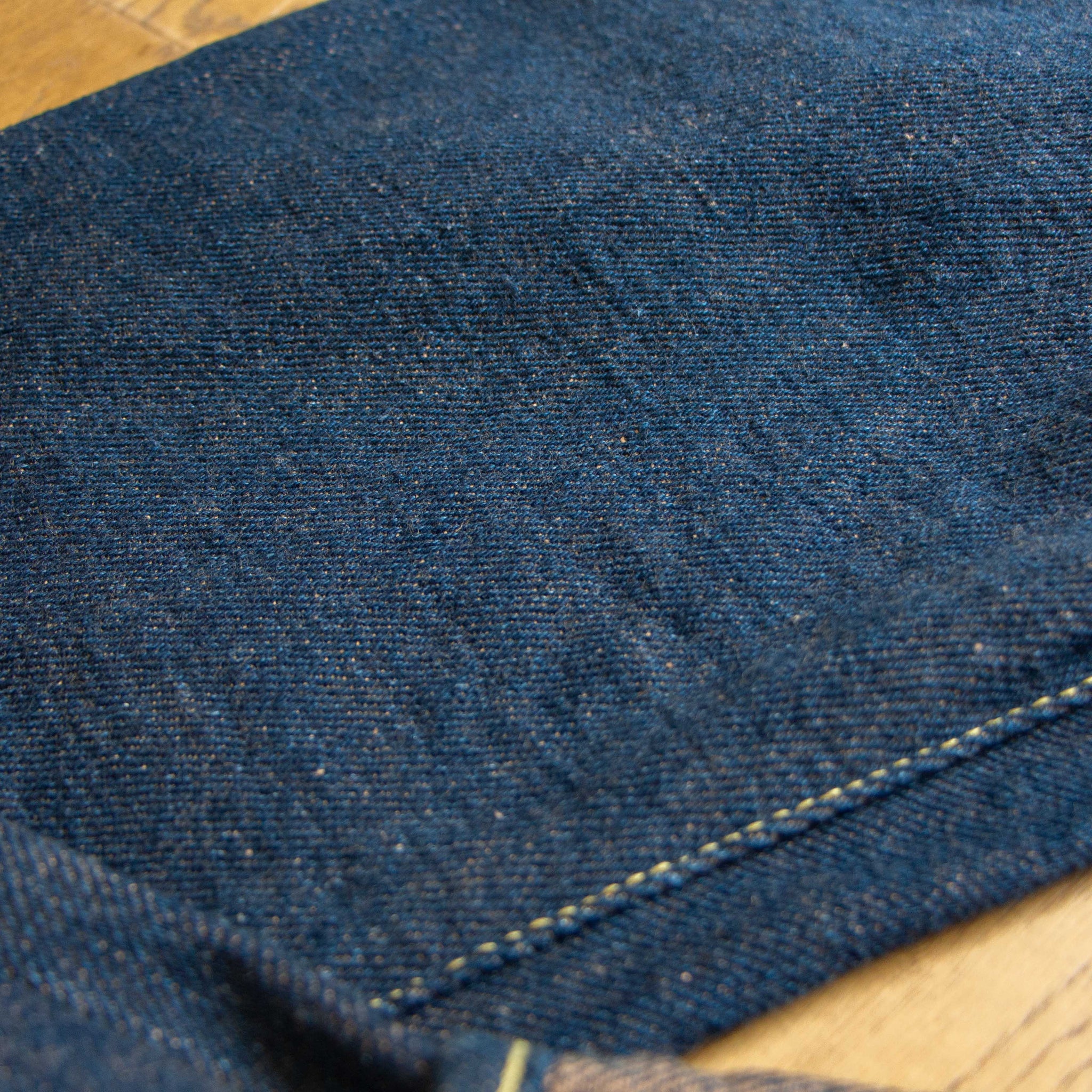 古董Levi’s所使用的紗線號數為6x7號線,這是典型的復古牛仔褲會使用的紗線配置,而ONI大膽地使用了3.7x3.7的極粗紗,原料的選用上混和了三種不同的棉花,在老式織布機上以ONI擅長的超級低張力進行織布,成品手感既厚而不像紙板,既粗糙佈滿毛感而不至於令人退卻,ONI為了達到特殊的布面藍色色調,對於每一塊布料的緯紗都會進行特殊調色,為達到「鬼秘」獨特的藍色澤,內面特意染色為米白色紗,質感溫潤並且上腳之後完全不咬腳。(或是說咬腿?)
