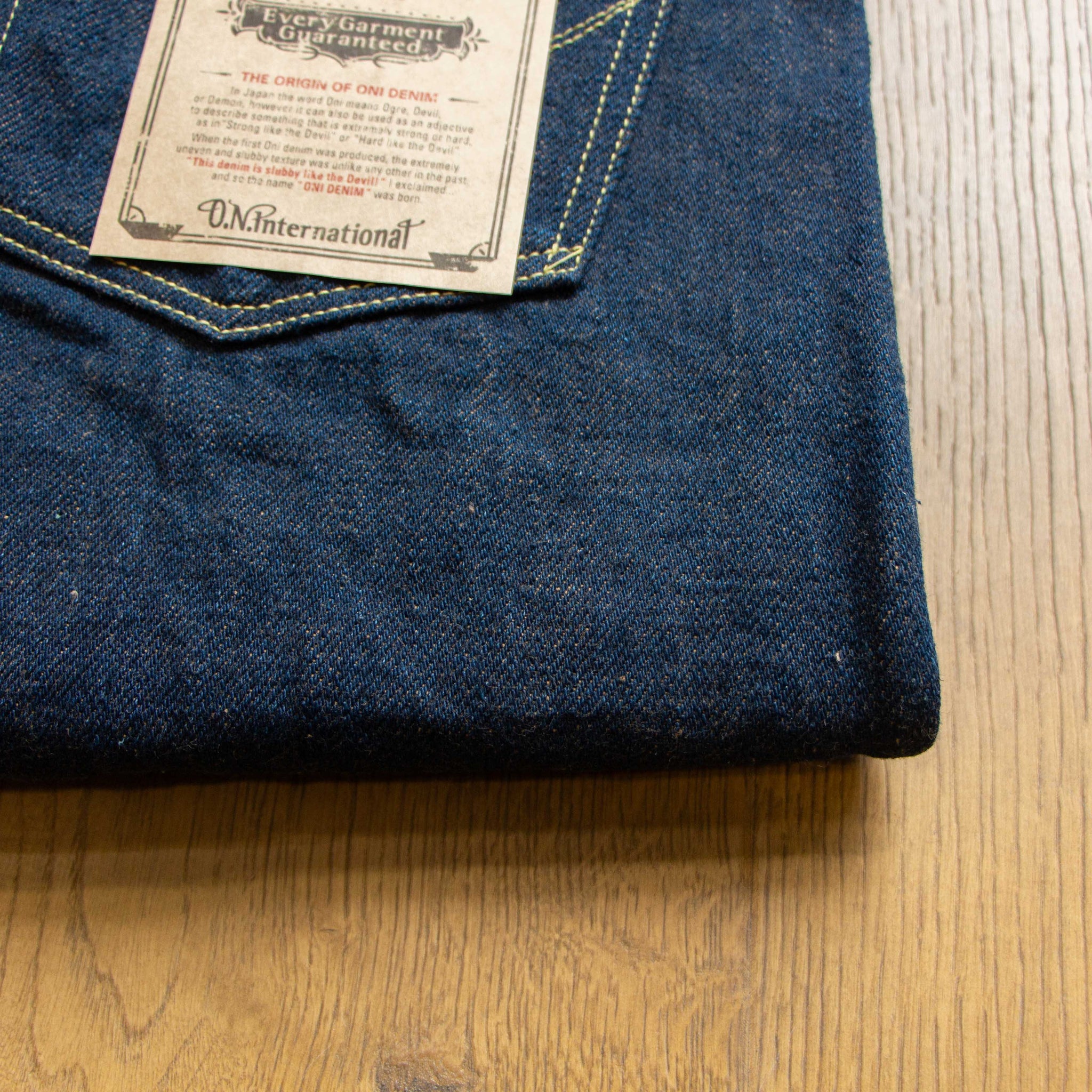Secret Denim (鬼秘丹寧、秘密丹寧) 於2012年首次發表,在那之後迎來爆炸性的熱度與持續的話題性,使得ONI的天分與作品在丹寧圈更廣泛獲得關注,原因無他,即是「鬼秘」天生自帶獨一無二的藍色調,儘管為20oz的超重磅厚度,加上布料本身極度粗糙的表面,穿著上卻有著柔軟的體感體驗,相對快速的色落特性也讓穿著者獲得滿滿的成就感。在日本眾多牛仔品牌中,「鬼秘」完全脫穎而出,僅靠著同好與選品店之間的口耳相傳,登上復古牛仔褲的高峰。