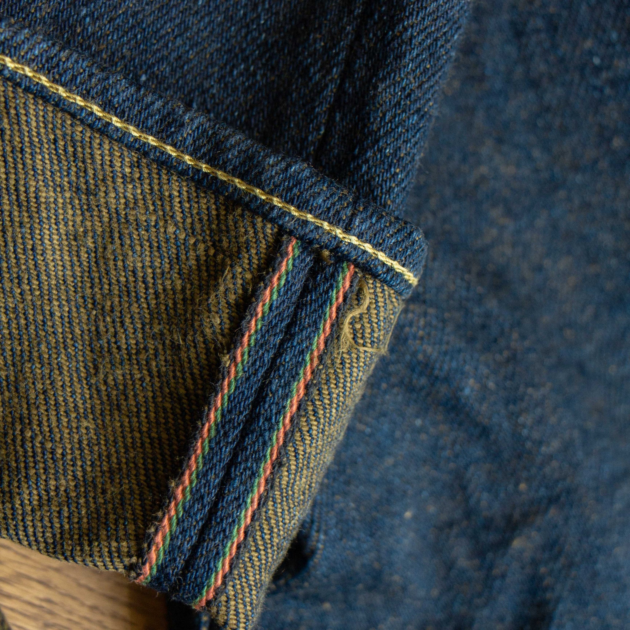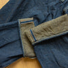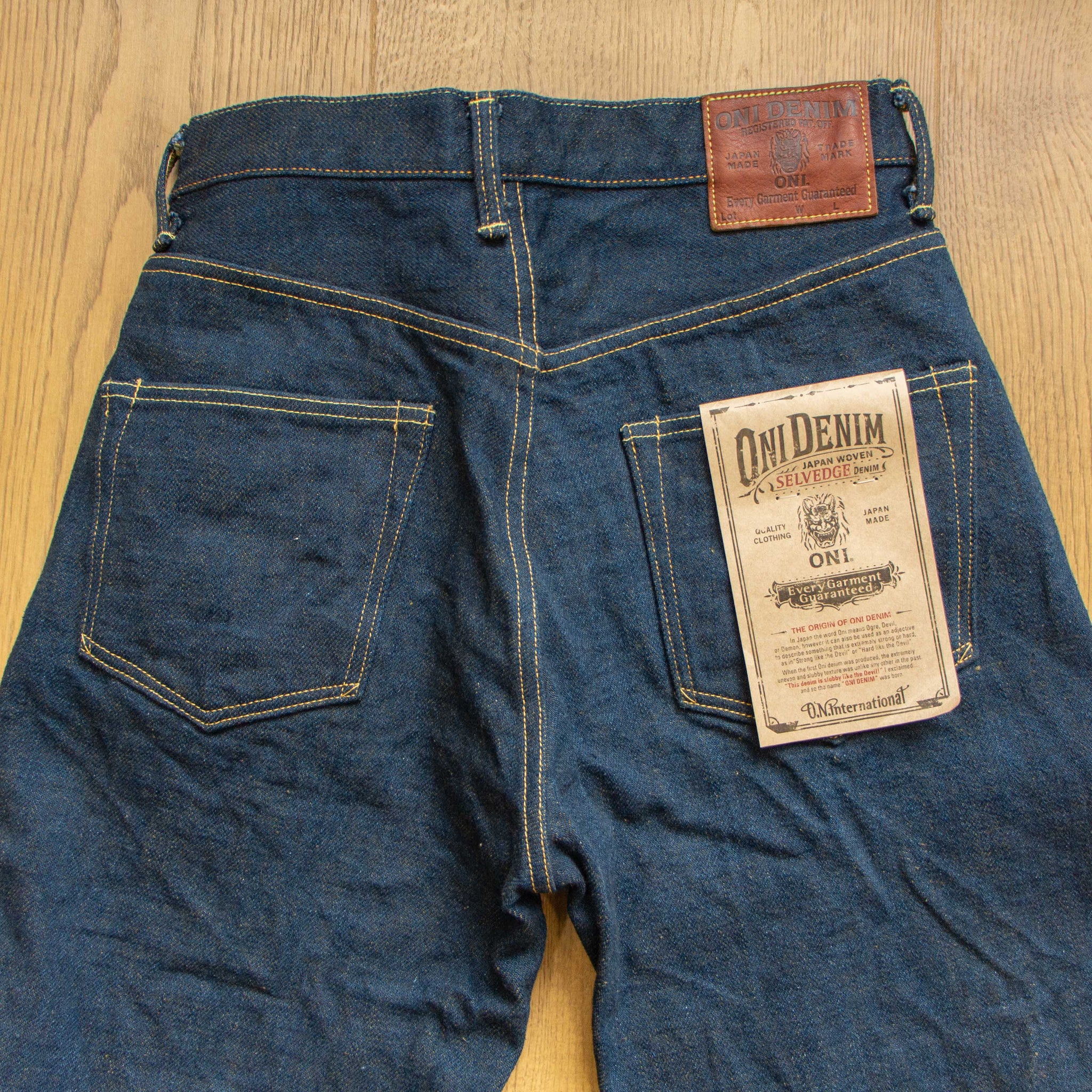 古董Levi’s所使用的紗線號數為6x7號線,這是典型的復古牛仔褲會使用的紗線配置,而ONI大膽地使用了3.7x3.7的極粗紗,原料的選用上混和了三種不同的棉花,在老式織布機上以ONI擅長的超級低張力進行織布,成品手感既厚而不像紙板,既粗糙佈滿毛感而不至於令人退卻,ONI為了達到特殊的布面藍色色調,對於每一塊布料的緯紗都會進行特殊調色,為達到「鬼秘」獨特的藍色澤,內面特意染色為米白色紗,質感溫潤並且上腳之後完全不咬腳。(或是說咬腿?)