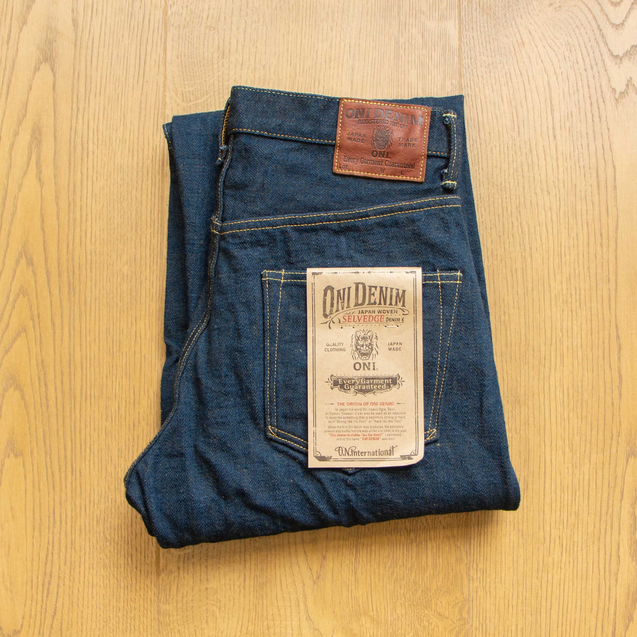 Secret Denim (鬼秘丹寧、秘密丹寧) 於2012年首次發表,在那之後迎來爆炸性的熱度與持續的話題性,使得ONI的天分與作品在丹寧圈更廣泛獲得關注,原因無他,即是「鬼秘」天生自帶獨一無二的藍色調,儘管為20oz的超重磅厚度,加上布料本身極度粗糙的表面,穿著上卻有著柔軟的體感體驗,相對快速的色落特性也讓穿著者獲得滿滿的成就感。在日本眾多牛仔品牌中,「鬼秘」完全脫穎而出,僅靠著同好與選品店之間的口耳相傳,登上復古牛仔褲的高峰。