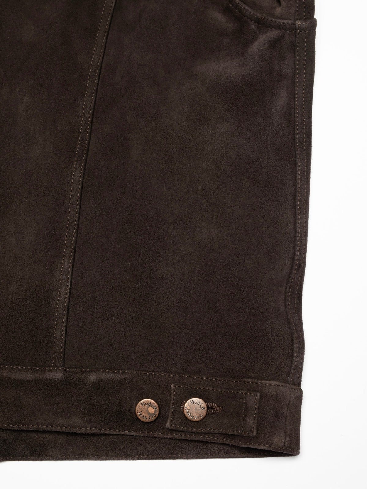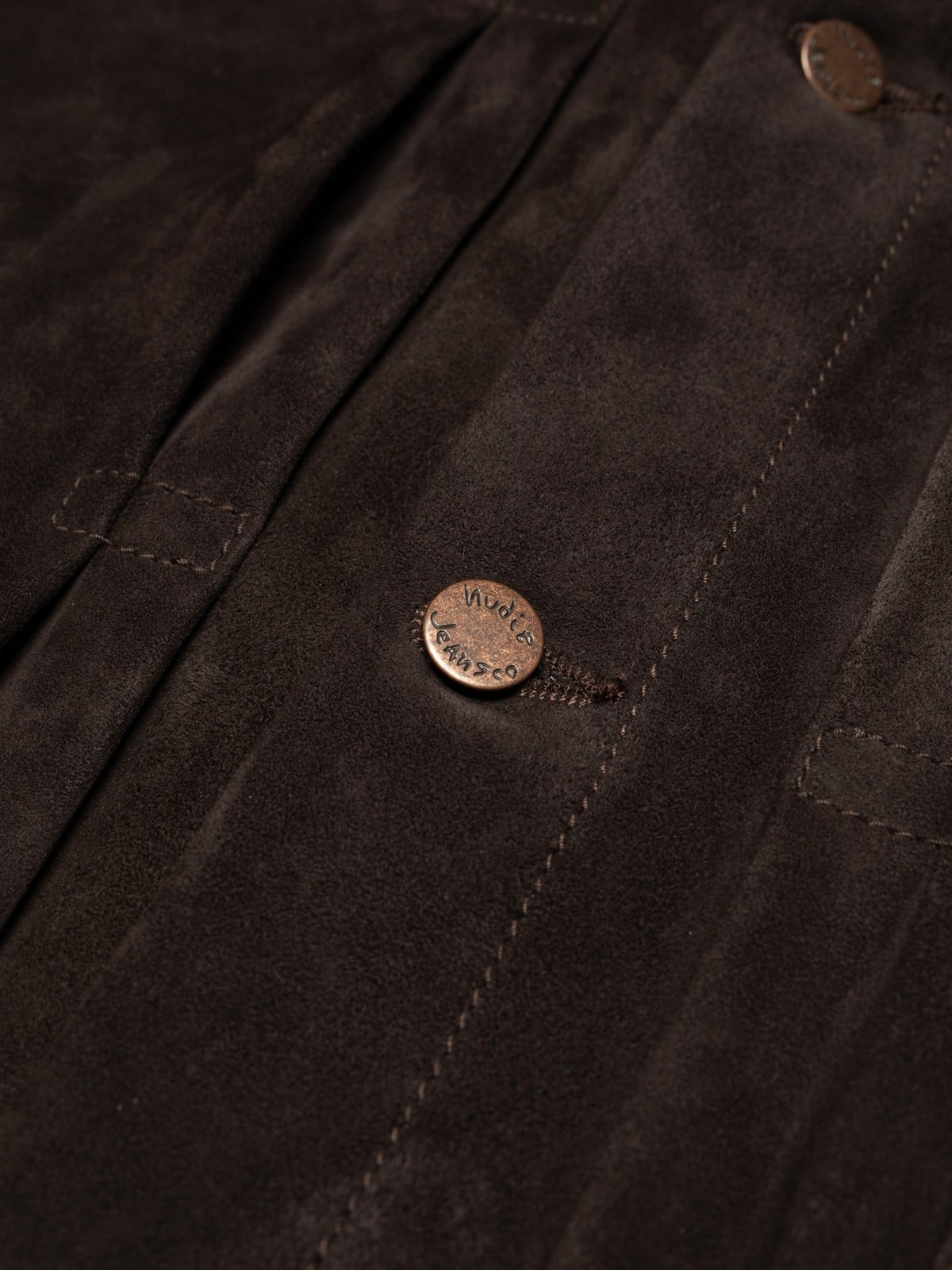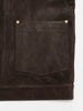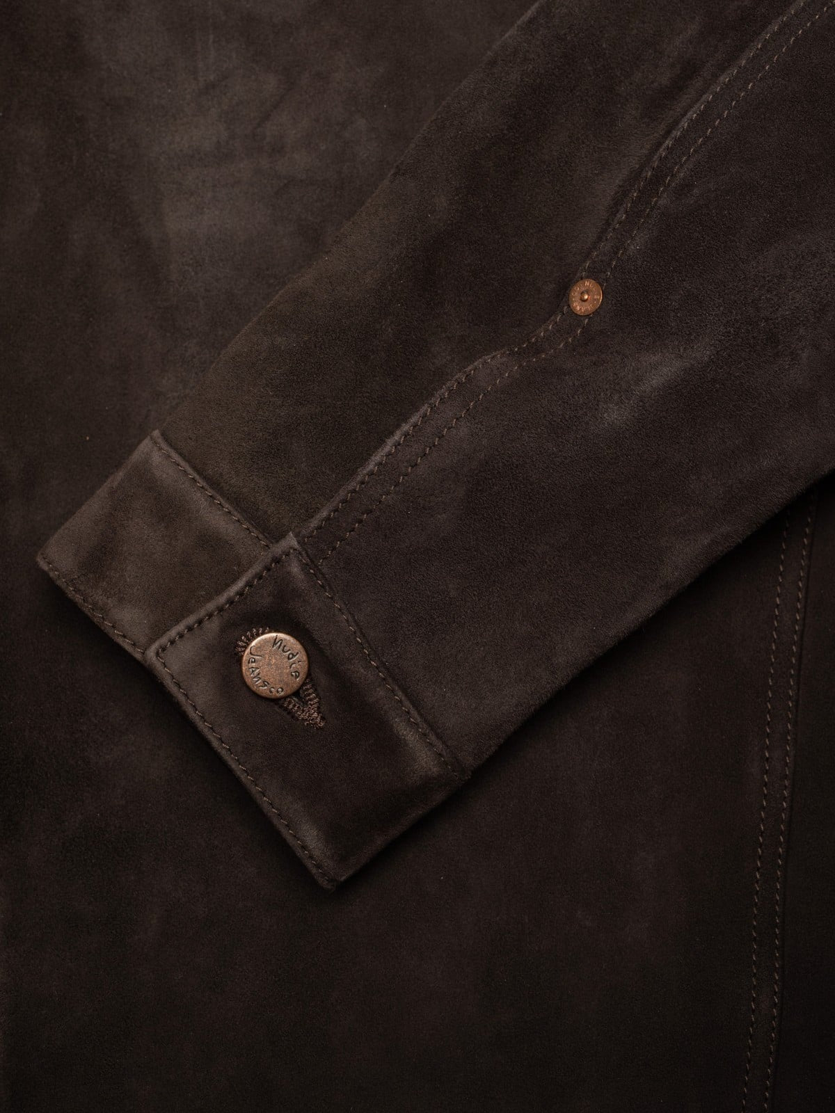 這款外套採用無可挑剔的柔軟、富有彈性的山羊皮麂皮製成, 呈現濃郁的深棕色調。剪裁與版型源自 Nudie 經典牛仔外套輪廓。