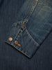 飽和度極高的基底色、鮮明的高光對比,以及一層使其整體帶有泥濘髒污感的綠色調, 突顯出丹寧布的原始紋理——揭示出明顯的垂直竹節紗效果和細微的大理石紋路。
