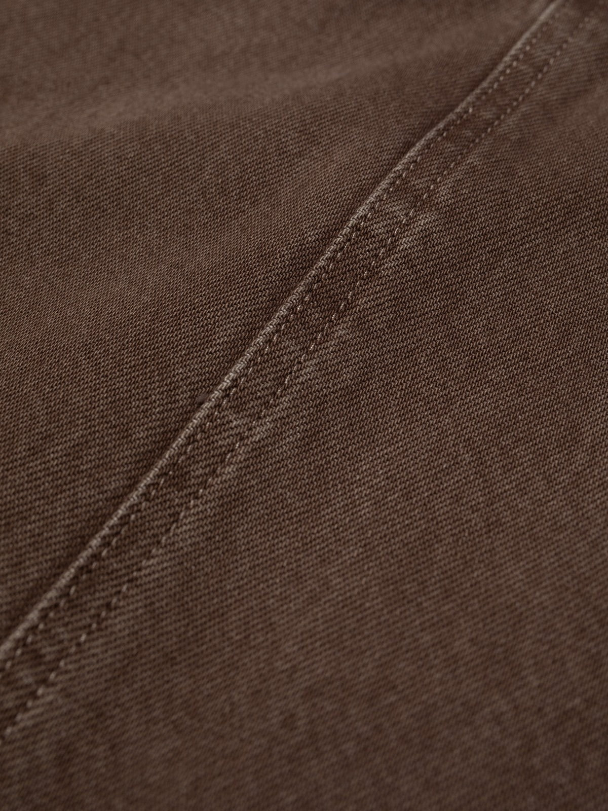 這款牛仔布呈現柔和的棕色調,經過水洗處理後,轉變成一種沉靜的大地紅棕色, 而灰色縫線則增添了微妙的對比感。