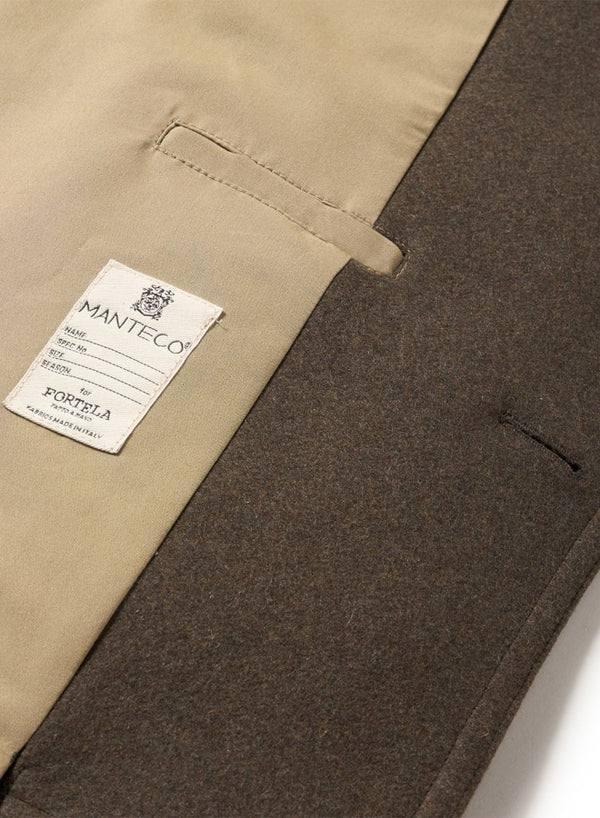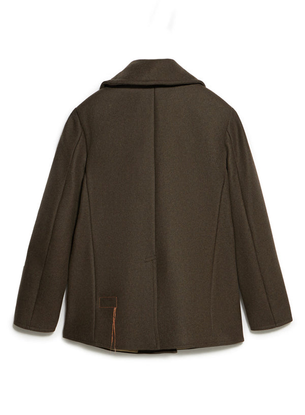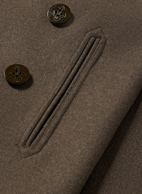 Double-breasted peacoat in heavy felted wool cloth by Manteco, inspired by the iconic U.S. Navy garment with a large collar and large lapels. Lined, vertical pockets and back slit. Galalite buttons with iconic Fortela logoed peacoat motif.