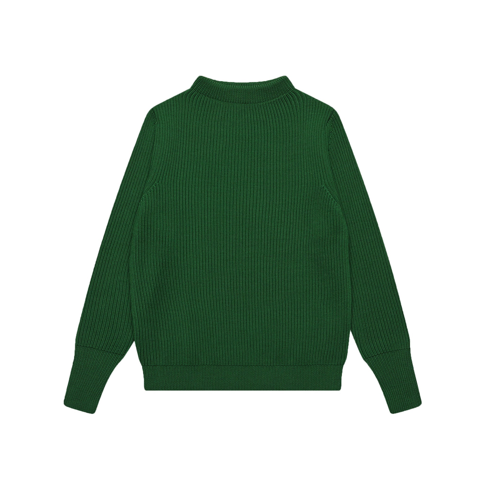 Firmly knitted cardigan jacket in half cardigan stitch with double folded sleeve ribs. Style has a cropped fit and side pockets with roll edges. Front placket with real buffalo horn buttons and inside placket tape. Fully fashioned knitted and linked together, only the inside of the pocket is overlocked. All assemblies are reinforced with bar tacks. Knitted on a 7 gauge flat knitting machine with 4 threads extra spun, pure new wool for a medium and durable quality.