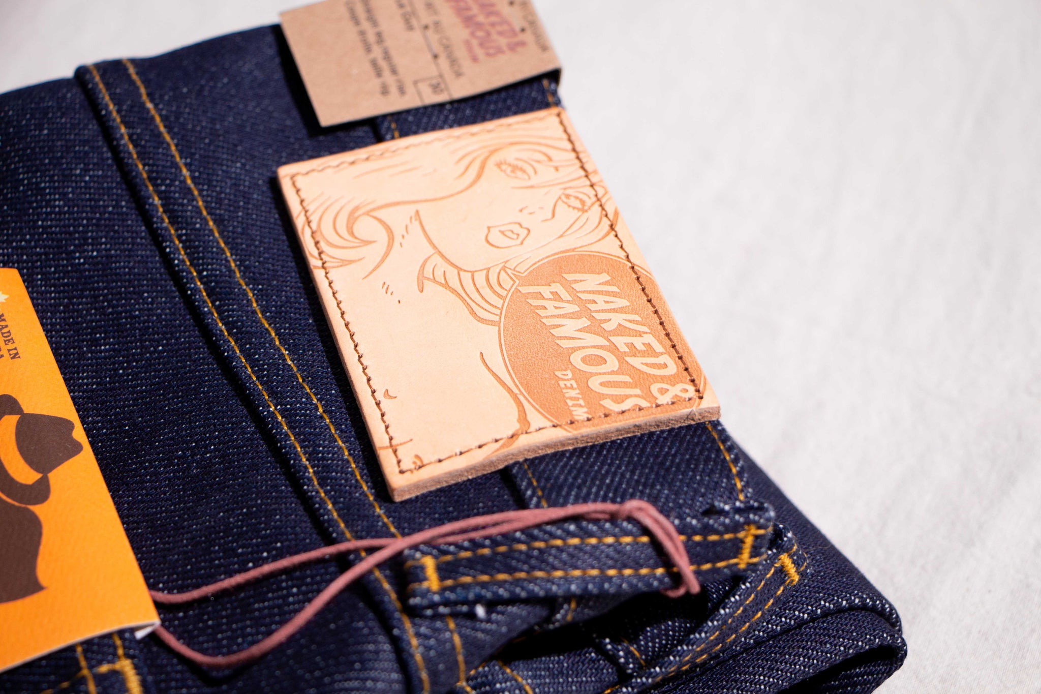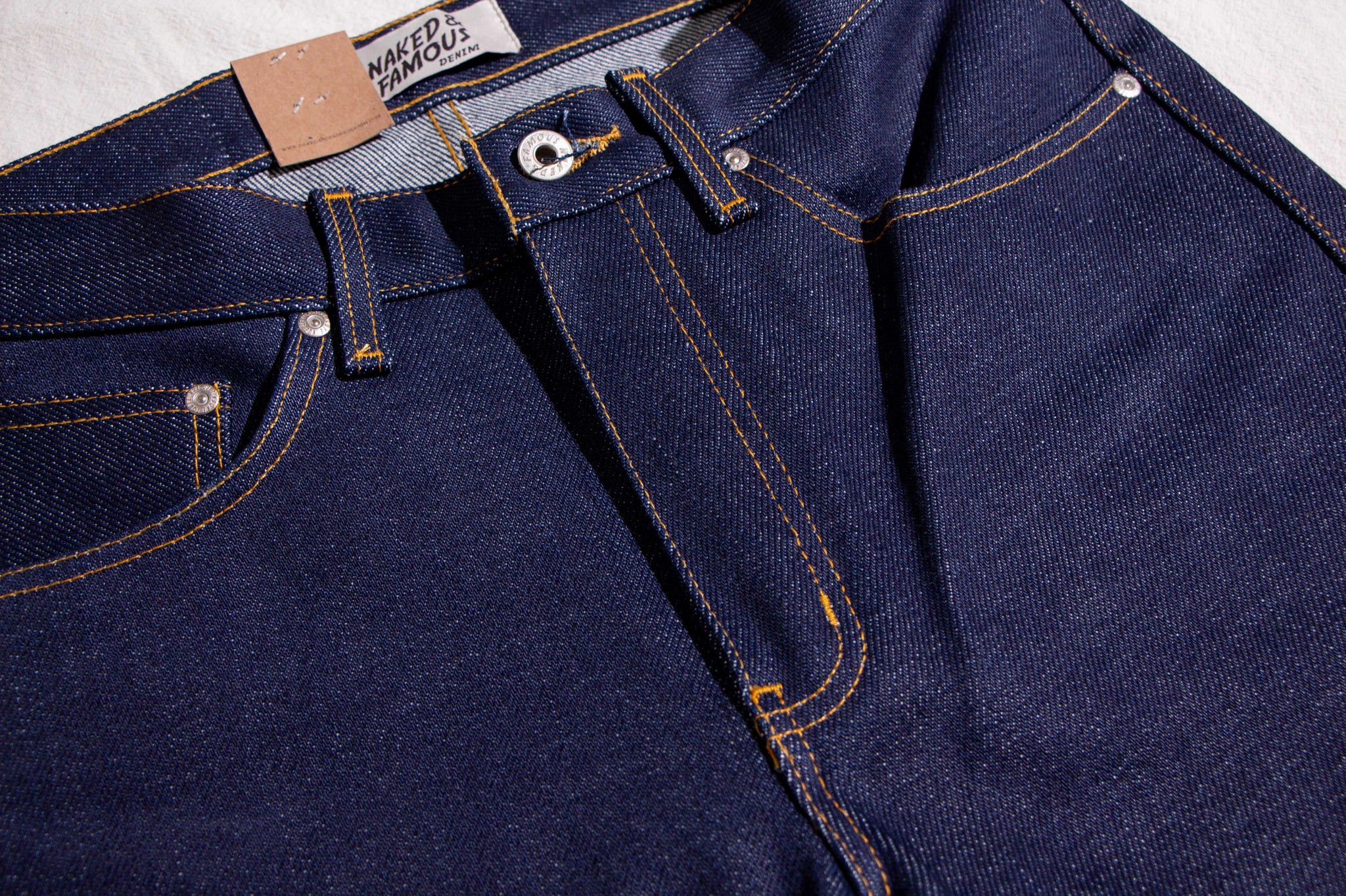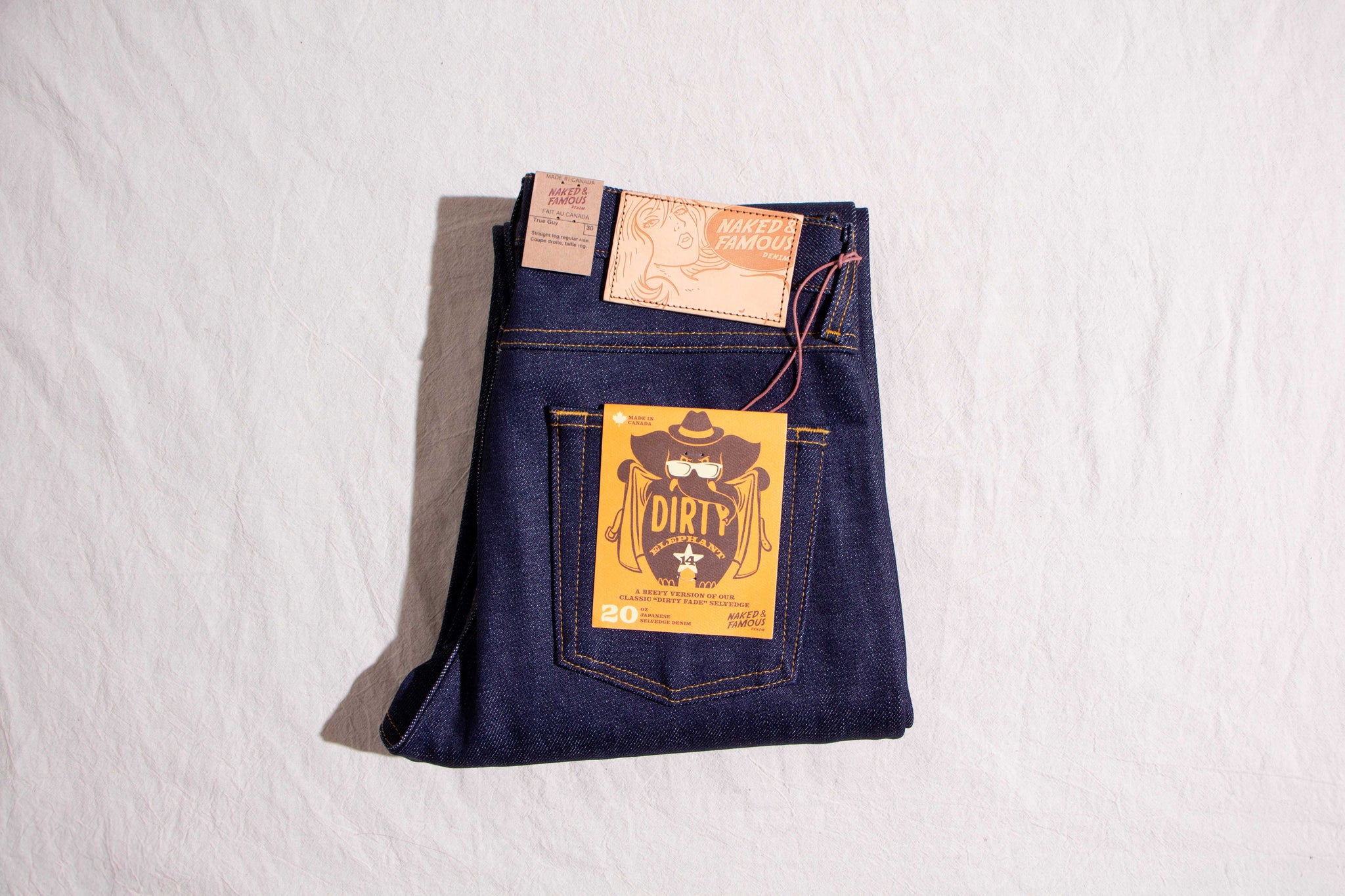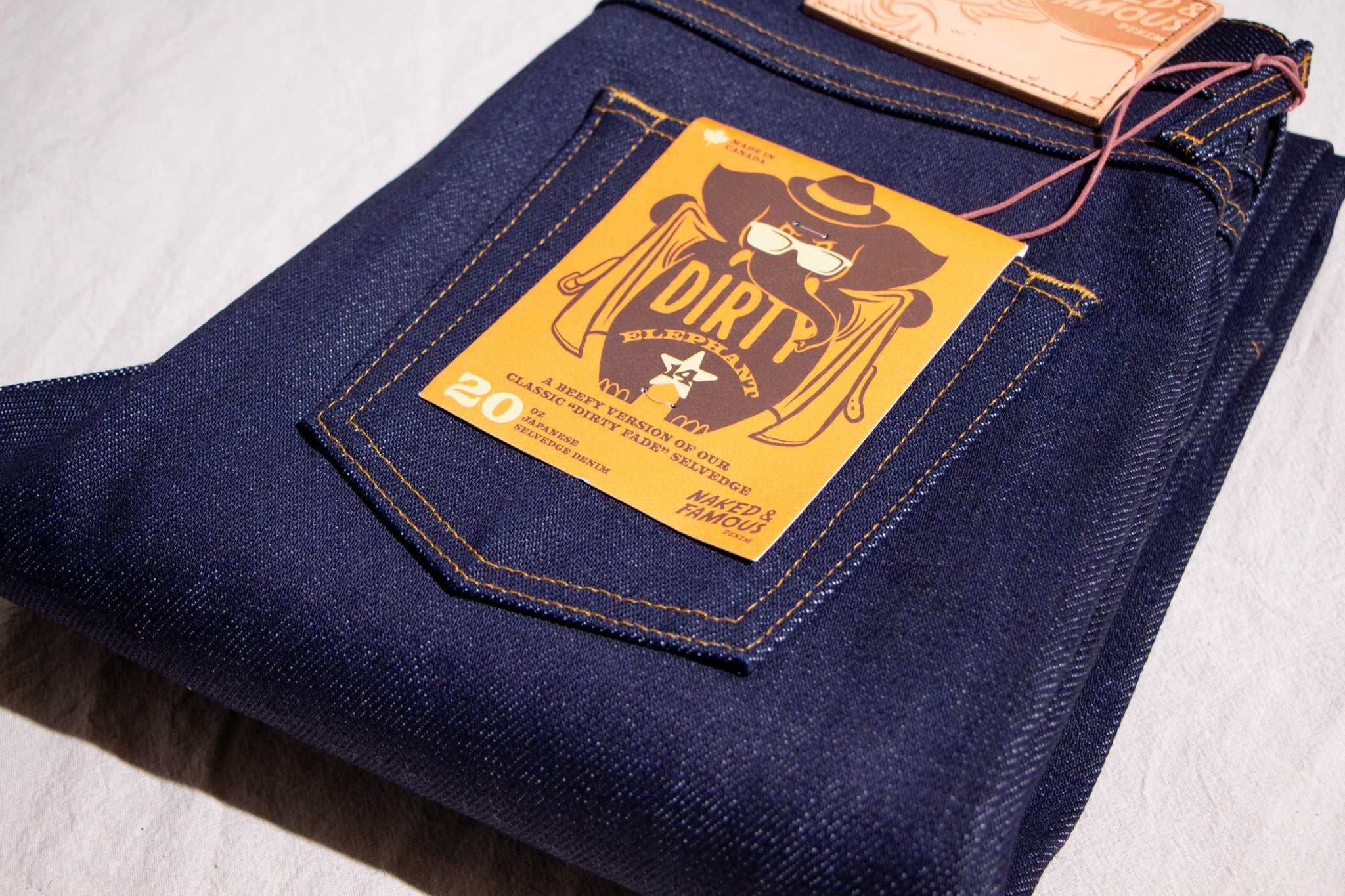 The Elephant 14 … aka Dirty Elephant is a 20oz super heavyweight Japanese selvedge denim that combines the bold, rugged weight of Naked and Famous's iconic Elephant series with the distinct character of one of Naked and Famous's most beloved core fabrics - Dirty Fade Selvedge. The warp yarns are rope-dyed in indigo, but start as naturally dusty brown cotton. As the denim fades with wear, layers of indigo chip away to reveal the earthy brown undertone beneath, giving this fabric its signature “dirty” fade. Finishing details include contrast stitching, a 5oz vegetable-tanned leather patch, a custom red/white/red selvedge ID, and silver metallic buttons and rivets. The