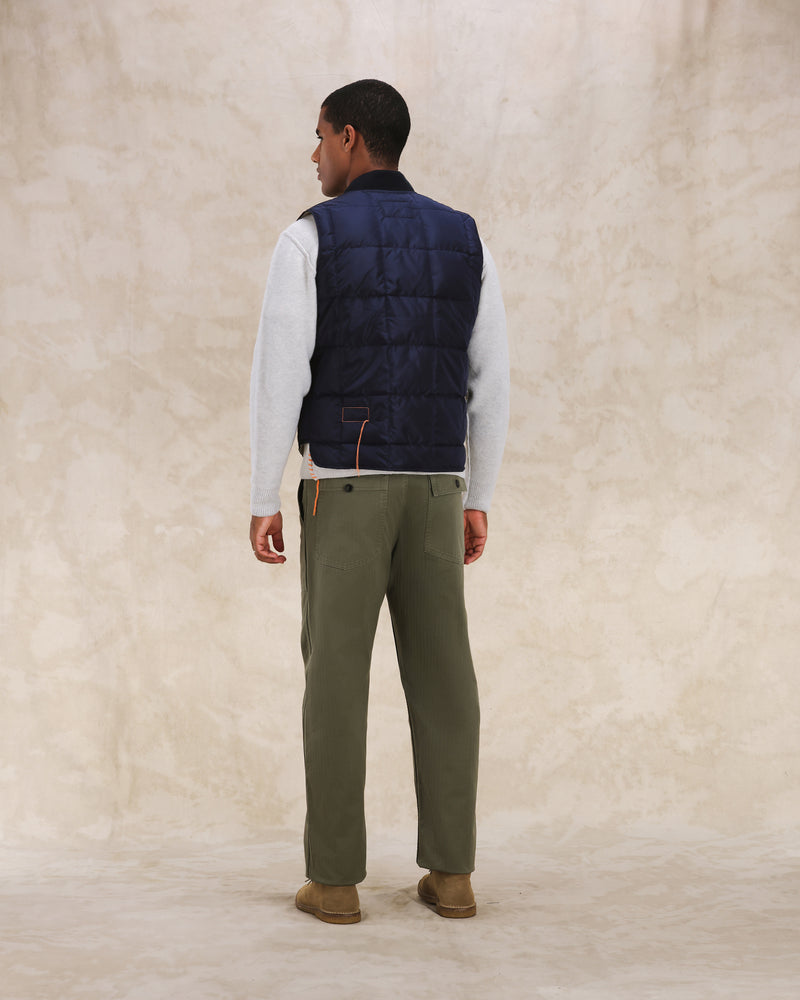 The vests slightly flared front flatters the silhouette, while the back features Fortelas signature orange-thread stitching, emphasizing its craftsmanship and longevity.
