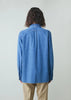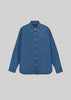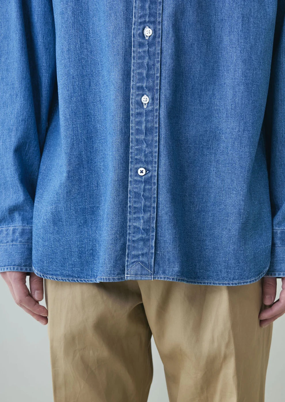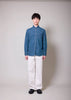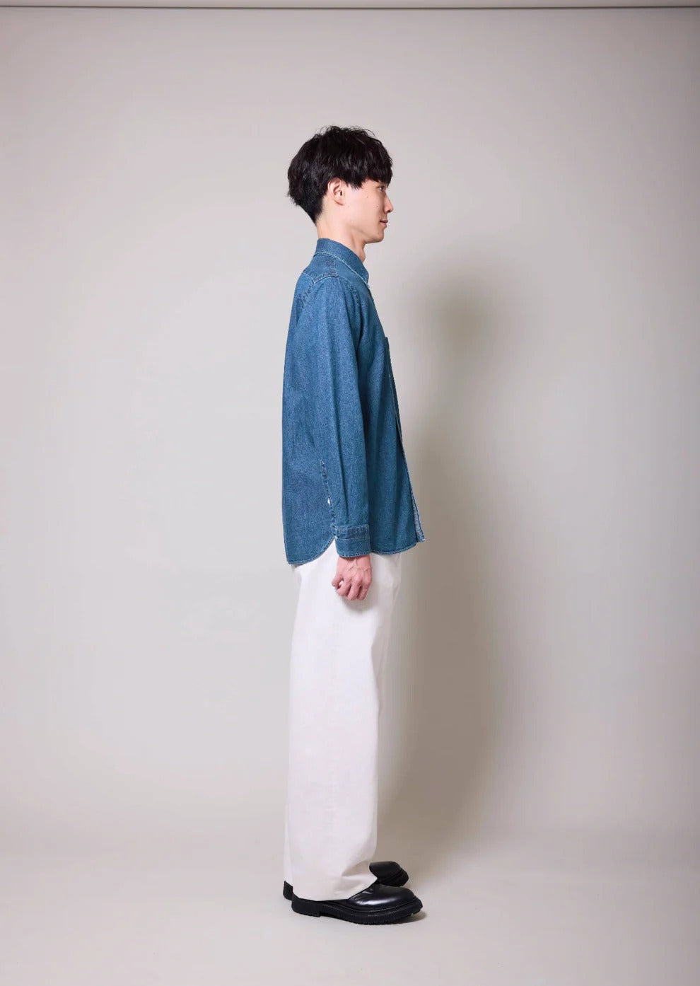 This denim shirt is built with a strong focus on construction. The collar features high-density stitching with thicker thread, creating a more stable structure and a defined shape. Inside the collar, cuffs, and placket, a 100% cotton brushed interlining is used to form a natural collar roll while maintaining subtle volume and support.