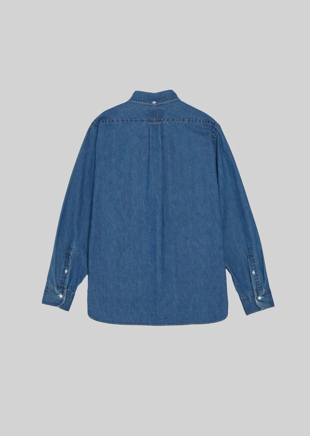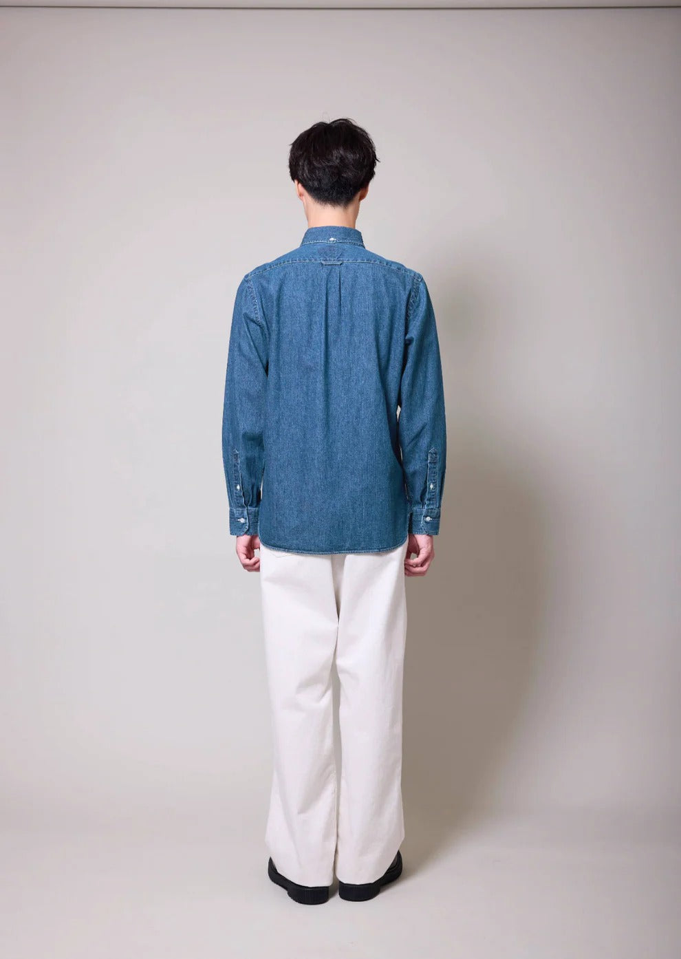 The fabric is an 8oz denim, woven with naturally irregular yarns and finished with a ball bio wash, giving it a subtle vintage texture with depth. A center stitch detail on the chest pocket adds a more defined appearance.