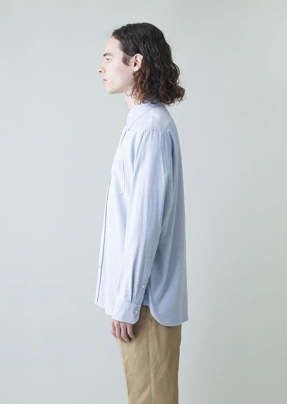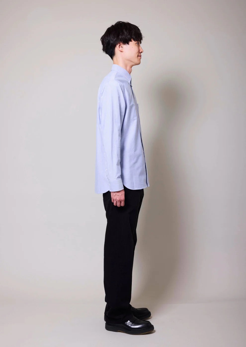 This oxford shirt is built with high-density stitching, featuring 24–26 stitches per 3 cm at the collar for a refined and stable structure. Inside the collar, cuffs, and placket, a 100% cotton brushed interlining is used to create a natural collar roll, while maintaining subtle volume and support throughout.