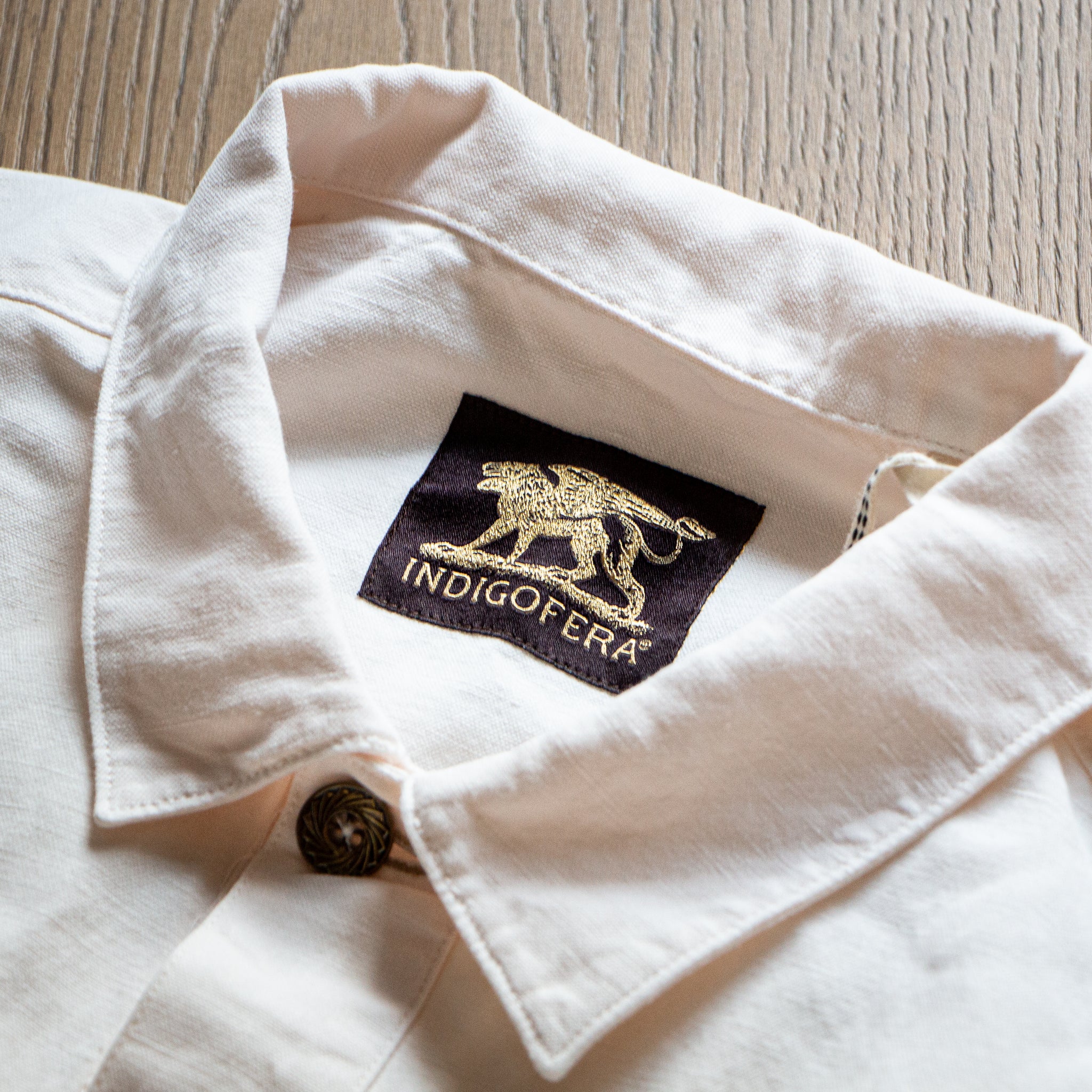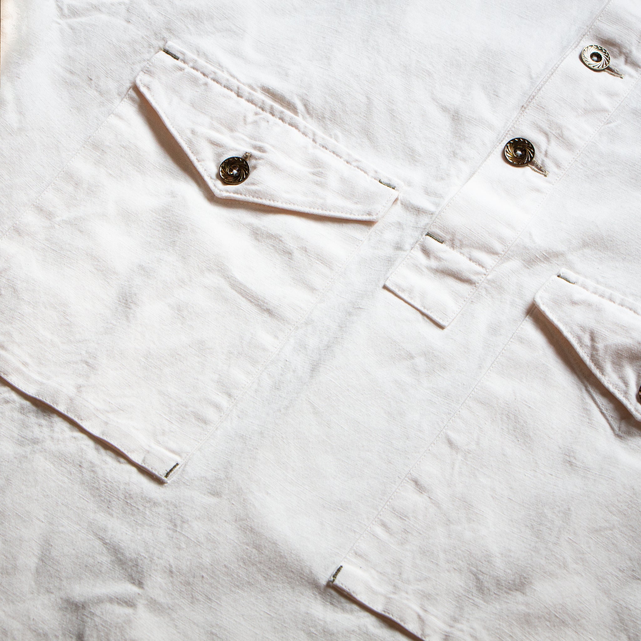 The Indigofera Terrence is a half-placket pullover shirt inspired by U.S. Navy uniforms from the World War II era. It is crafted from an undyed cotton-linen blend that retains the natural color and character of the fibers, offering both breathability and a substantial hand feel. The design features a half-button front with Japanese-made metal enamel buttons and two large front pockets, combining vintage military inspiration with modern refinement.
