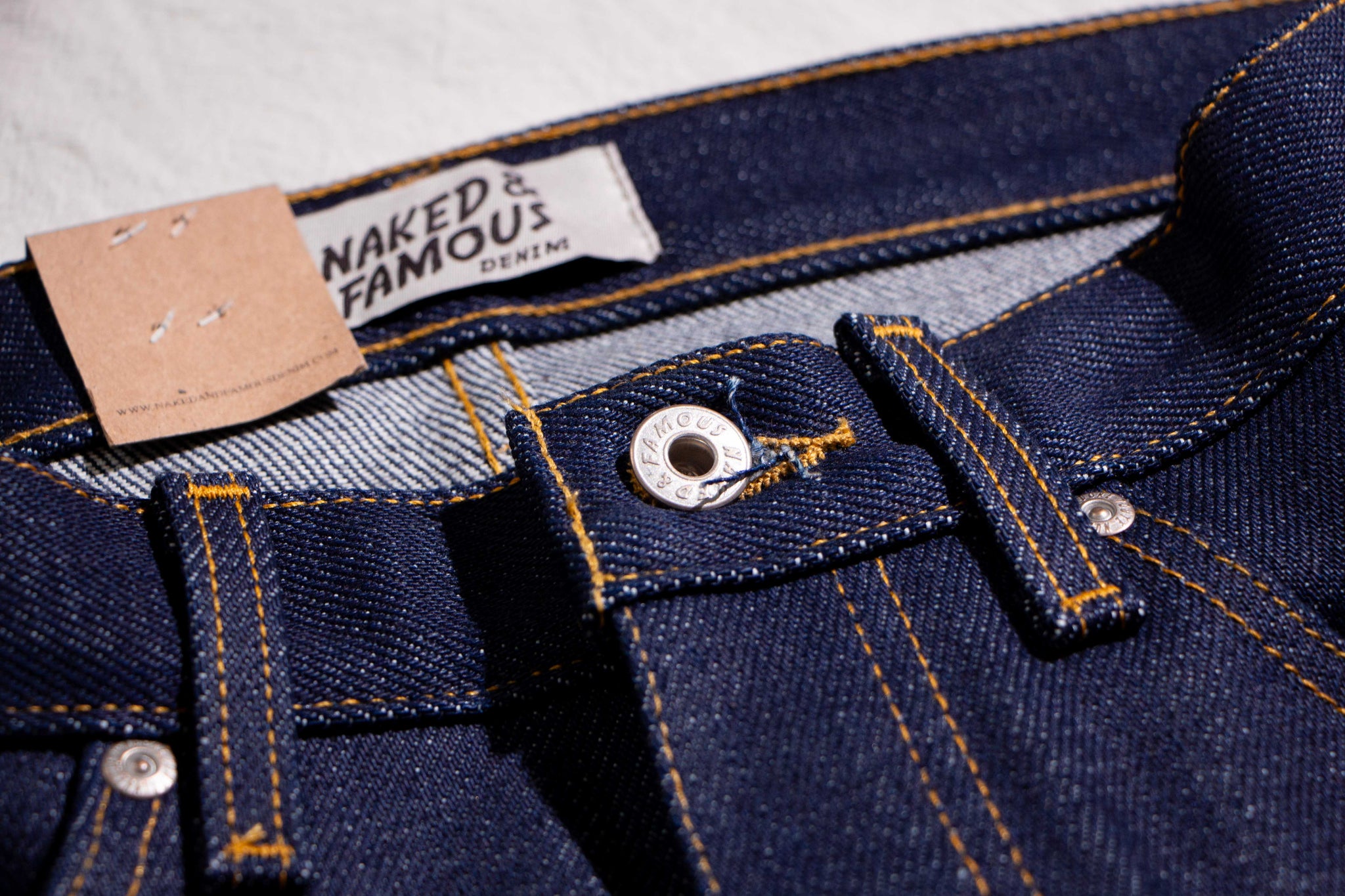 The Elephant 14 … aka Dirty Elephant is a 20oz super heavyweight Japanese selvedge denim that combines the bold, rugged weight of Naked and Famous's iconic Elephant series with the distinct character of one of Naked and Famous's most beloved core fabrics - Dirty Fade Selvedge. The warp yarns are rope-dyed in indigo, but start as naturally dusty brown cotton. As the denim fades with wear, layers of indigo chip away to reveal the earthy brown undertone beneath, giving this fabric its signature “dirty” fade. Finishing details include contrast stitching, a 5oz vegetable-tanned leather patch, a custom red/white/red selvedge ID, and silver metallic buttons and rivets. The