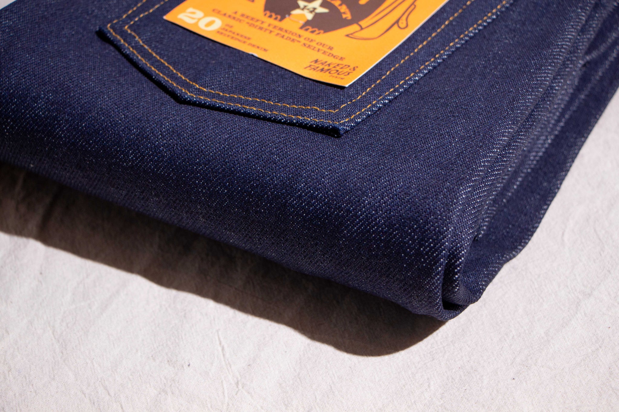 The Elephant 14 … aka Dirty Elephant is a 20oz super heavyweight Japanese selvedge denim that combines the bold, rugged weight of Naked and Famous's iconic Elephant series with the distinct character of one of Naked and Famous's most beloved core fabrics - Dirty Fade Selvedge. The warp yarns are rope-dyed in indigo, but start as naturally dusty brown cotton. As the denim fades with wear, layers of indigo chip away to reveal the earthy brown undertone beneath, giving this fabric its signature “dirty” fade. Finishing details include contrast stitching, a 5oz vegetable-tanned leather patch, a custom red/white/red selvedge ID, and silver metallic buttons and rivets. The