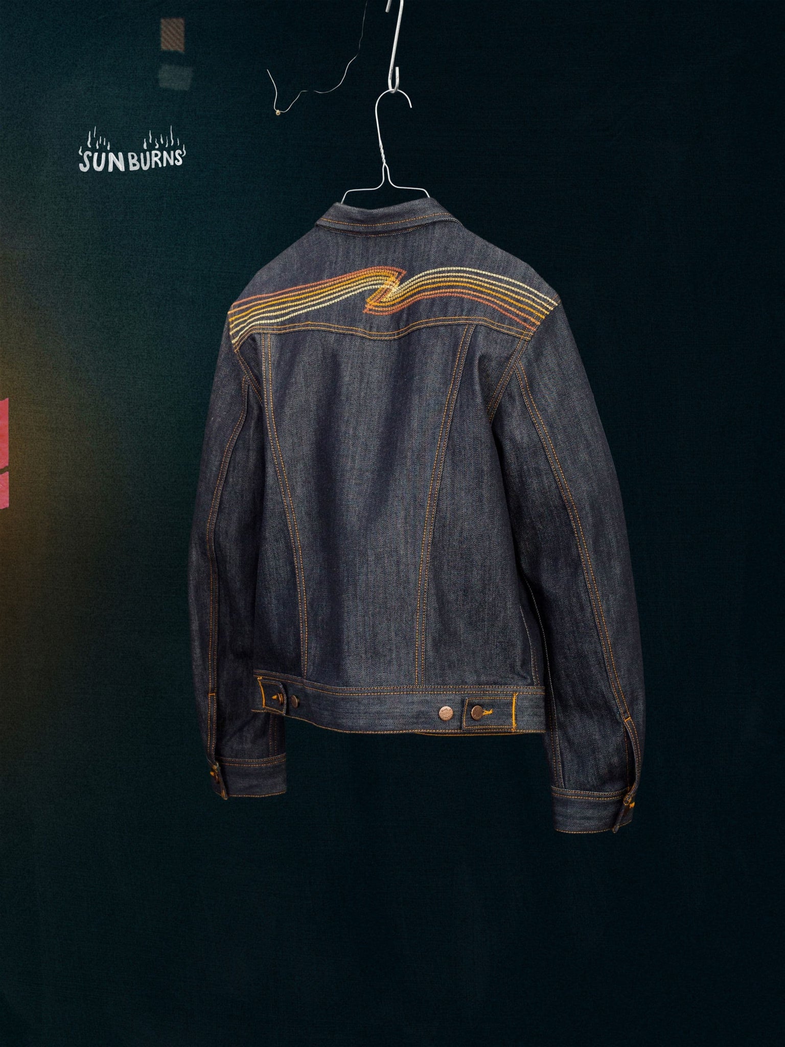 The Conny Denim Jacket Sunburns makes an unapologetic statement with its gradient back yoke embroidery, spanning from shoulder to shoulder. Shifting from deep orange to pale yellow, with Nudie Jeans Orange at the center, it burns across the back like a sun-scorched imprint.