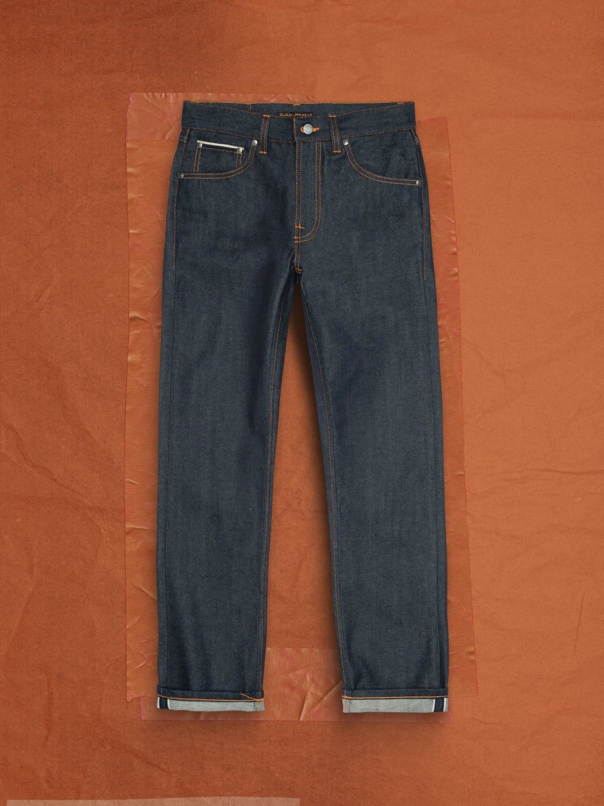 Nudie's signature orange thread provides a bold contrast, while the navy back pocket embroidery becomes more prominent as the denim ages. With wear, these selvage jeans develop a unique, worn-in character that is truly individual to the wearer.