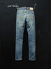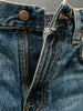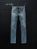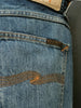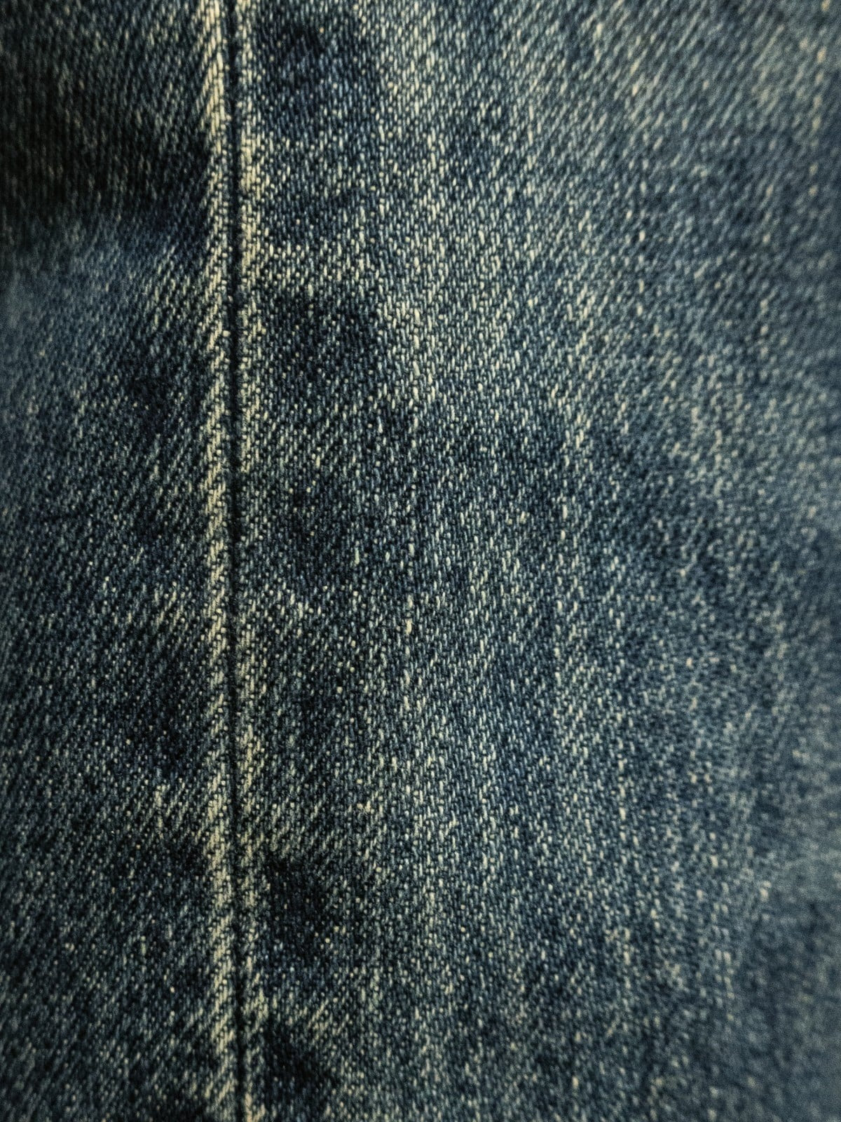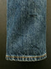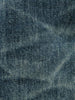 Crafted from exceptional denim, these jeans are washed to a rich, deep indigo tone with a subtle warmth. The fabric features a rugged texture with pronounced vertical slubs and a marble-like pattern that accentuates the darker areas, adding depth and character. The recreated fades and wear marks deliver an undeniably authentic worn-in aesthetic.