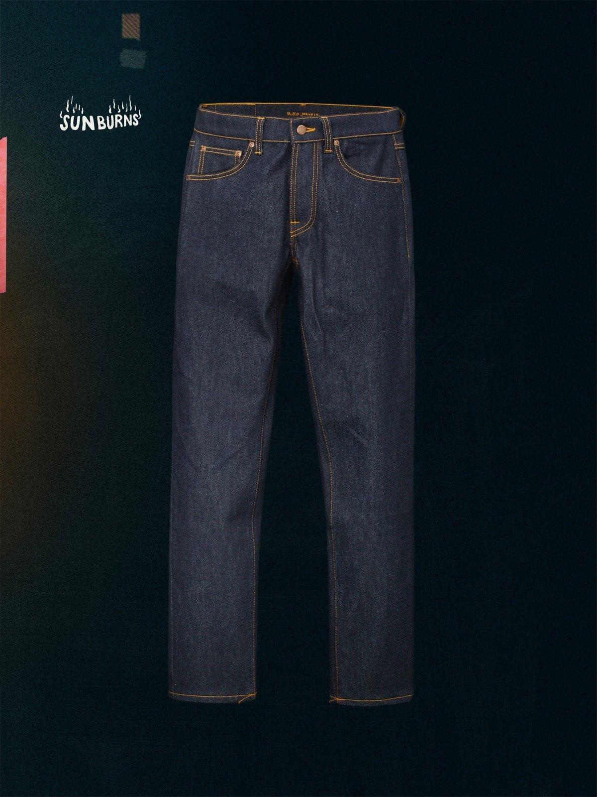 Solid Ollie Dry Sunburns stands out with its gradient back pocket embroidery, shifting from deep orange to pale yellow, with Nudie Jeans Orange at the center. Paired with a special graphic Jacron patch, it subtly plays with Nudie’s identity and iconography.