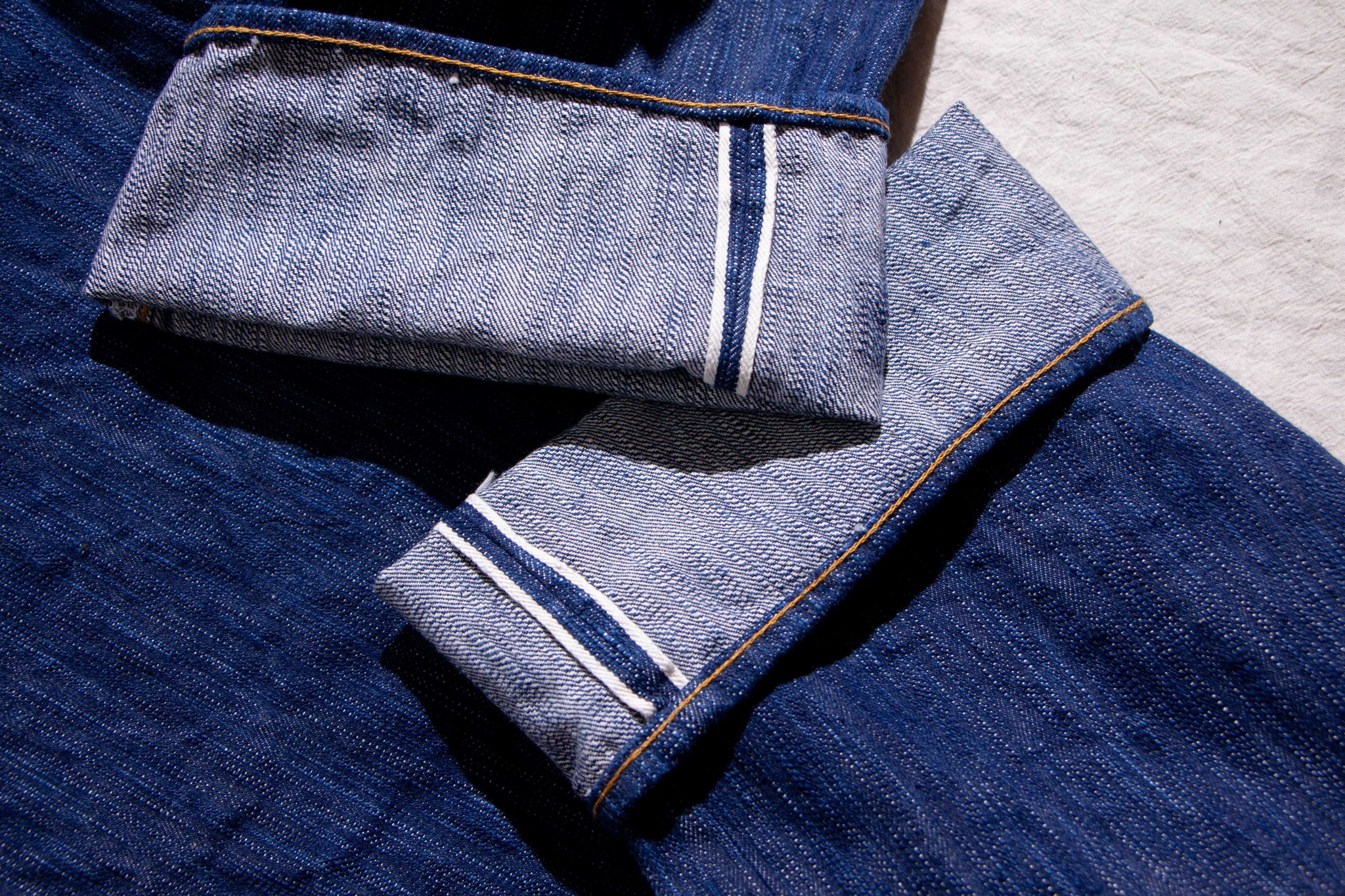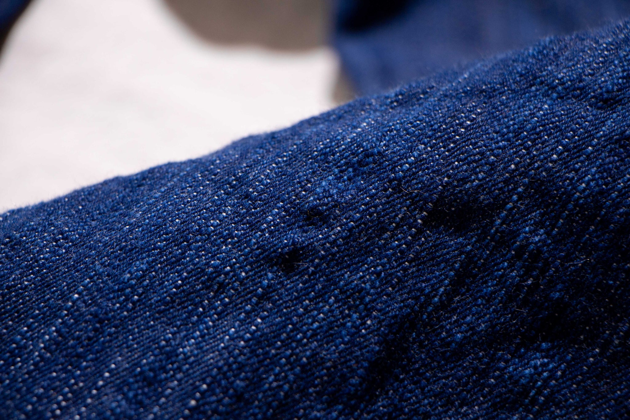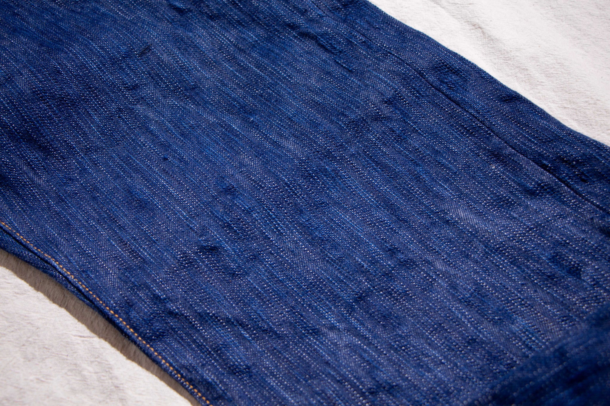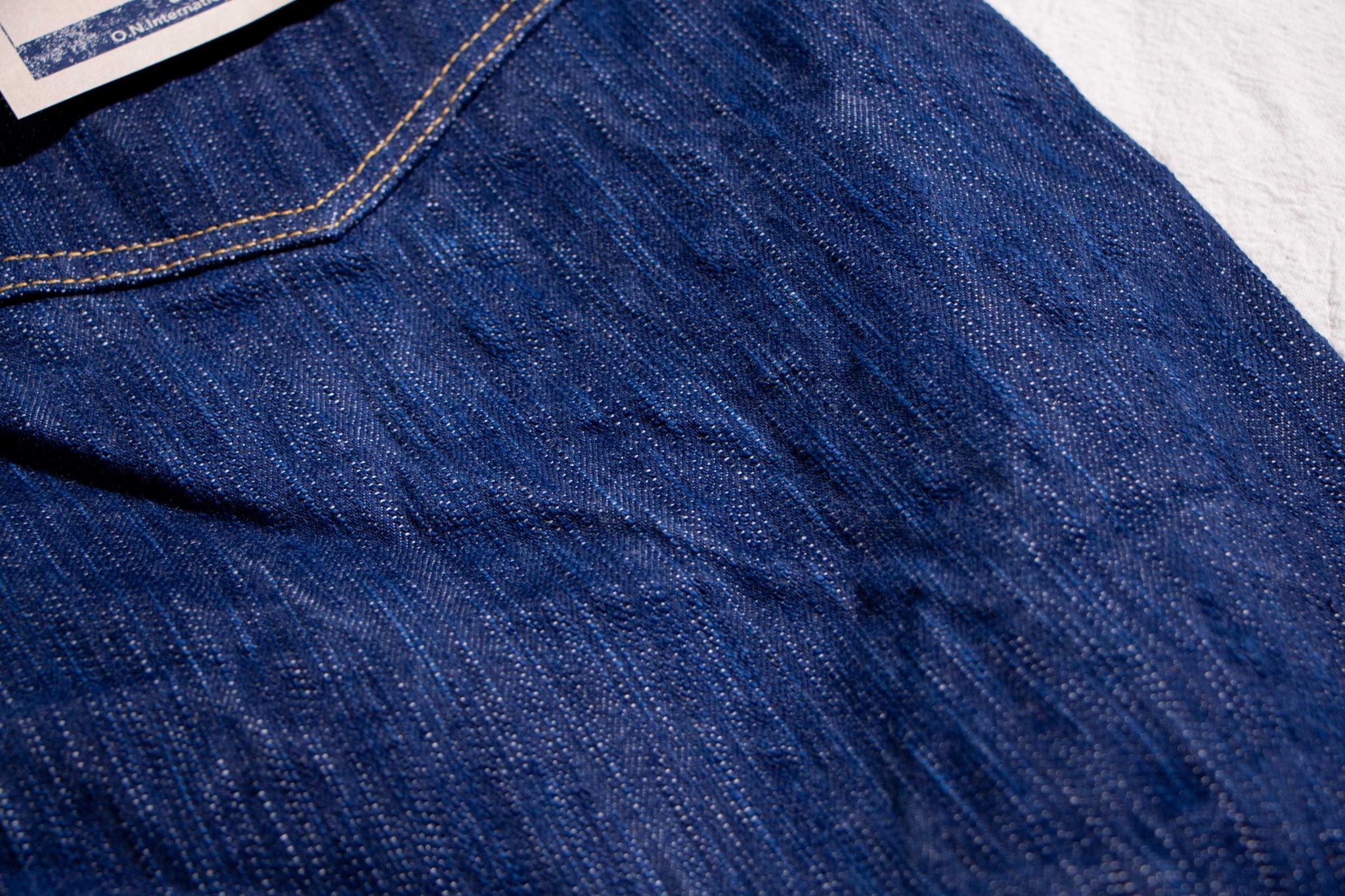 ONI Denim's "Awa Shoai" fabric is a premium artisanal Japanese selvedge denim line renowned for its hand-dyed natural indigo using the traditional Awa Shoai Aizome technique from Tokushima Prefecture. This method involves labor-intensive hank dyeing on thick cotton yarns, yielding an uneven, richly textured surface. ONI selects a special combination of extra thick yarns and hand arranged the yarns on the shuttle loom to create its unique mid heavyweight fabric. The thick, irregular yarns absorb dye unevenly, creating slubby textures and a three-dimensional feel.