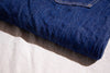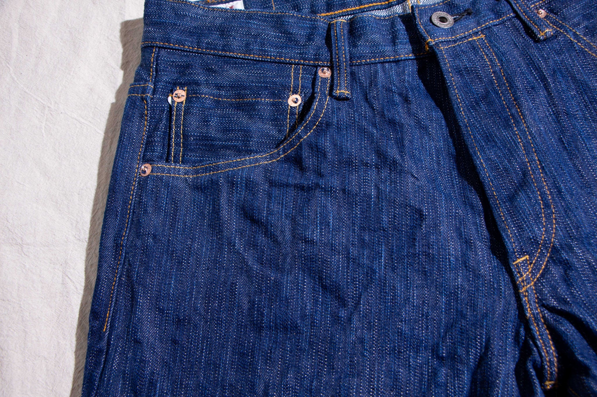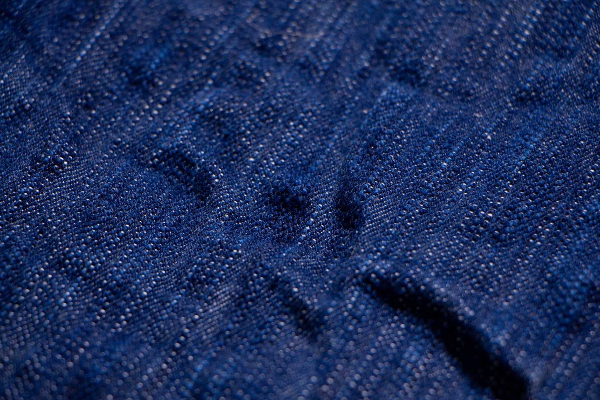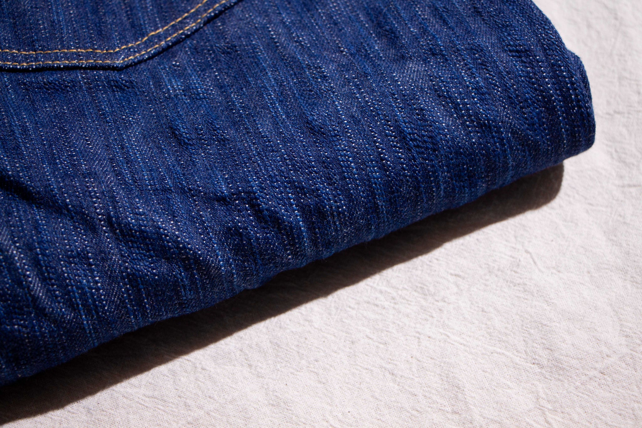 ONI Denim's "Awa Shoai" fabric is a premium artisanal Japanese selvedge denim line renowned for its hand-dyed natural indigo using the traditional Awa Shoai Aizome technique from Tokushima Prefecture. This method involves labor-intensive hank dyeing on thick cotton yarns, yielding an uneven, richly textured surface. ONI selects a special combination of extra thick yarns and hand arranged the yarns on the shuttle loom to create its unique mid heavyweight fabric. The thick, irregular yarns absorb dye unevenly, creating slubby textures and a three-dimensional feel.