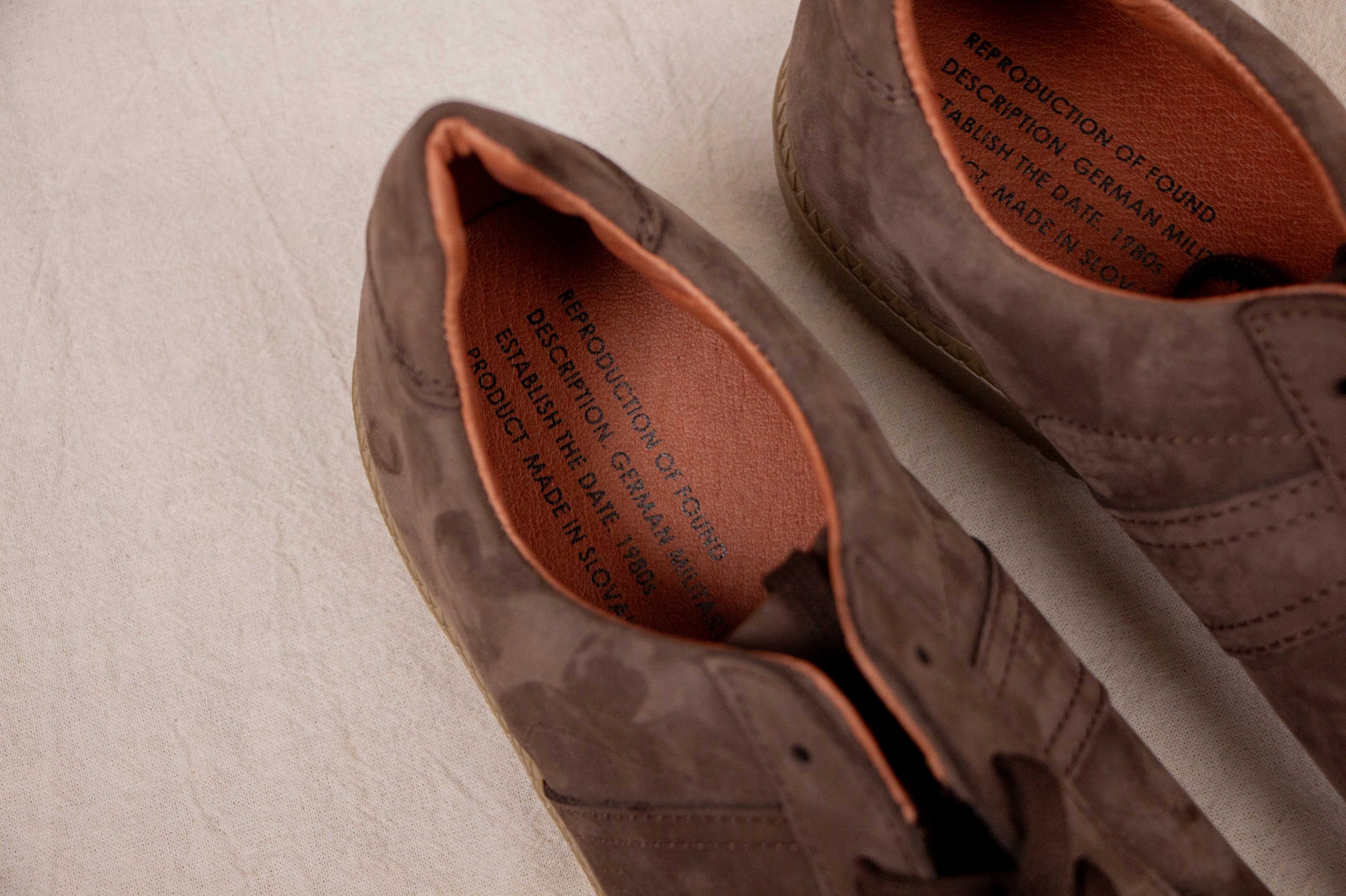 Reproduction of Found's German Military Trainers are a distinct blend of historical military footwear and contemporary craftsmanship. Originating from a Japanese brand, these trainers pay homage to military classics from the 1980s, renowned for their durable and minimalist design. The trainers were initially mass-produced during the Cold War and became popular through German Army surplus stores.
