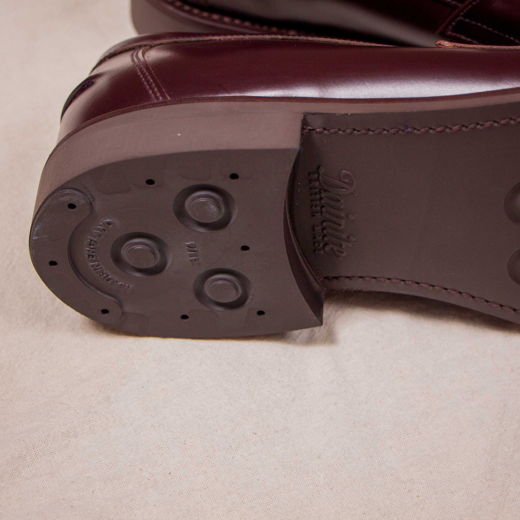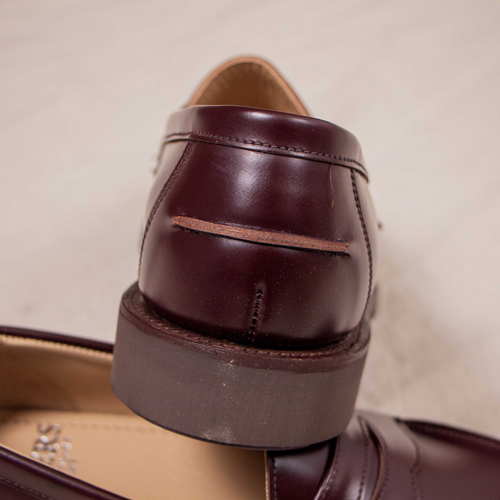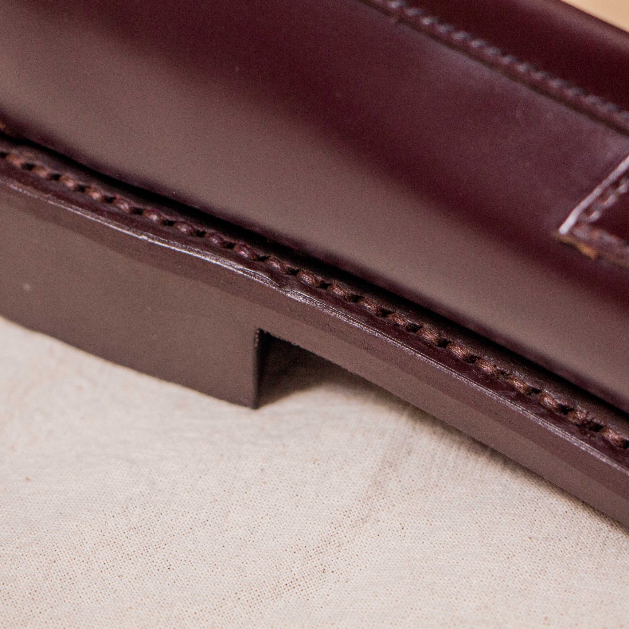 This product's name originates from stitching together two pieces of leather. The PORON® used in the insole, is known for its excellent shock absorption and cushioning properties. It allows for long-term performance even after multiple uses. The upper features grained leather, which is resistant to scratches and dirt, and has a soft texture. The use of a ridgeway sole ensures durability even in various weather conditions and during prolonged use.