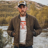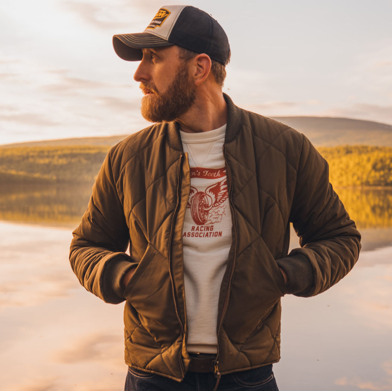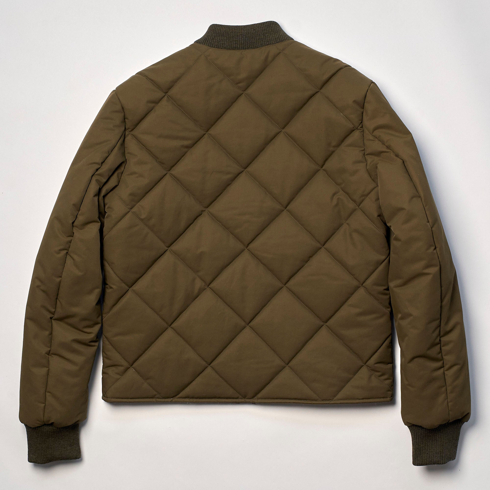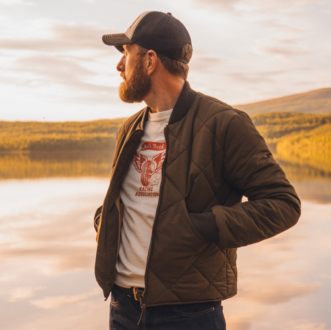 Inspired by 1950s Skyliner Jackets and revisited with a distinctive Italian touch, the “Alaska” Olive Skyliner Jacket represents an authentic garment made with Comfortemp® Thermo-Fibre Padding and an external layer crafted from Olmetex® 60/40 fabric — a technical textile masterpiece made in Como, Italy since 1952.