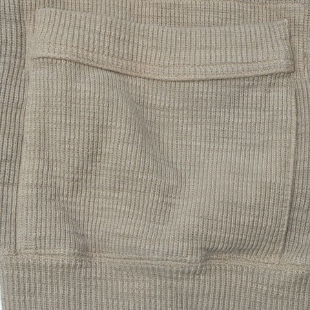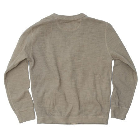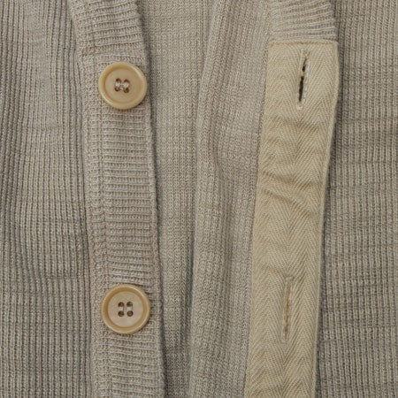 This piece uses a custom slub yarn to capture the desired character, woven into a dense 11.8 oz single rib knit with a rich, uneven texture. To ensure durability, the shoulders and back neckline are reinforced with anti-stretch tape. The button placket and buttonholes are also strengthened with cotton tape construction.