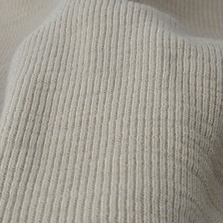 The single rib knit fabric recreates the texture of garments once made from Gara spinning yarns. “Gara spinning” refers to yarn produced on old spinning machines that made a rattling sound. These machines, now obsolete, lacked precision, which resulted in yarn with natural unevenness. What was once considered an imperfection has become the very quality that gives the fabric its distinct look and feel.