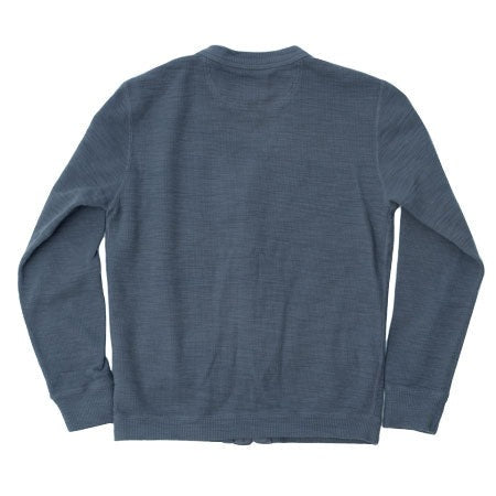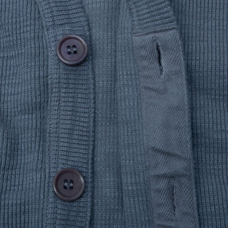 This piece uses a custom slub yarn to capture the desired character, woven into a dense 11.8 oz single rib knit with a rich, uneven texture. To ensure durability, the shoulders and back neckline are reinforced with anti-stretch tape. The button placket and buttonholes are also strengthened with cotton tape construction.