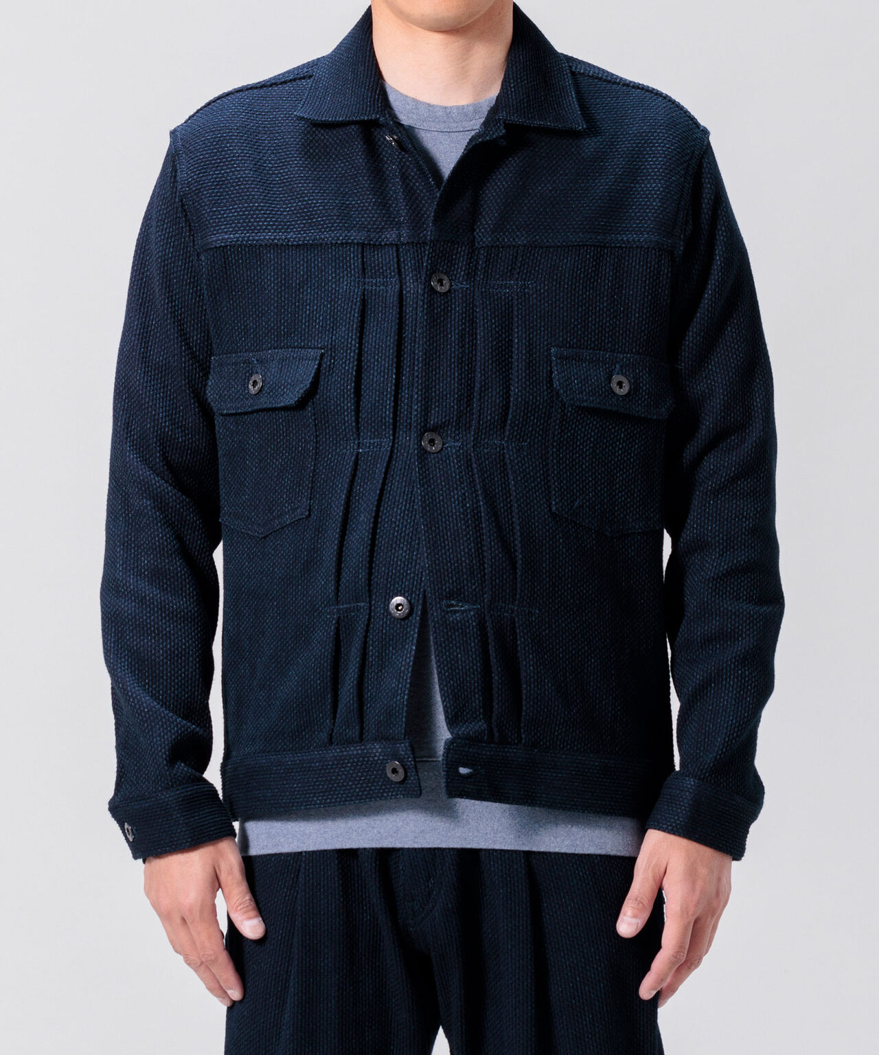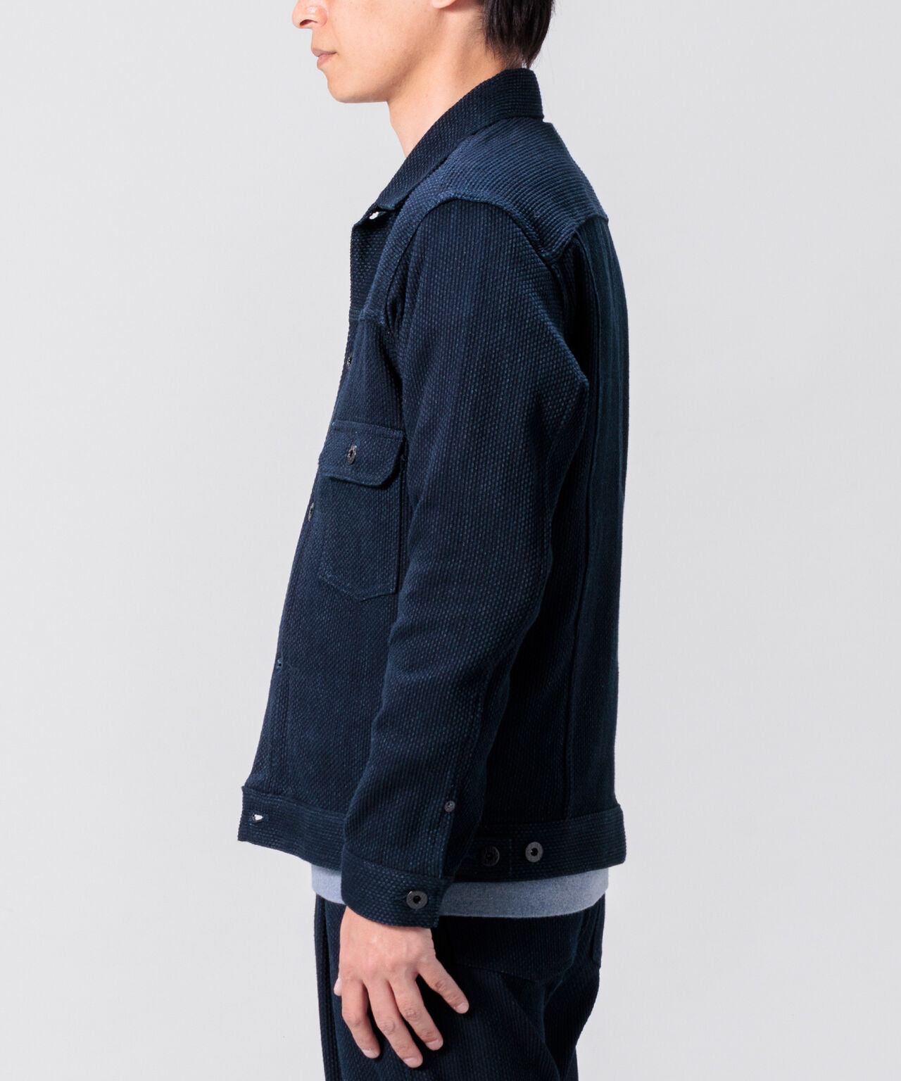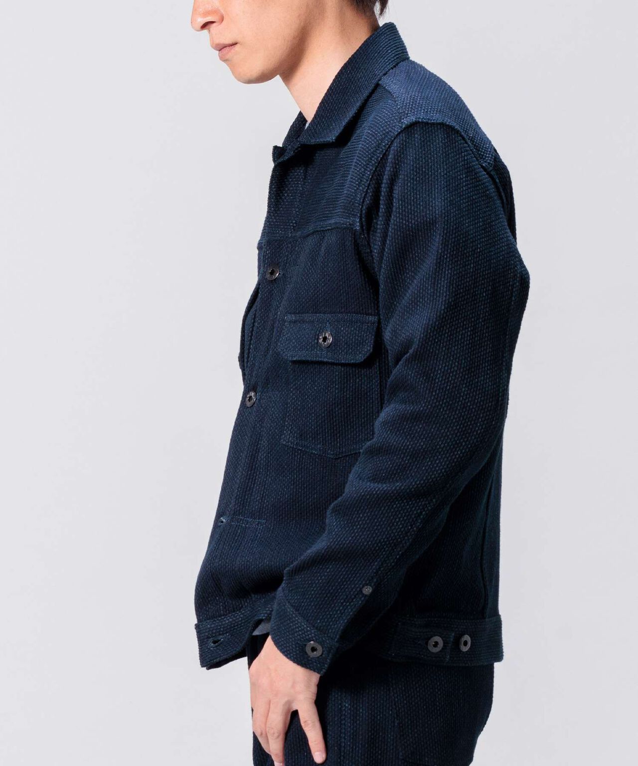 JBJ 的靛藍刺子織布料採用與丹寧相同的繩染工藝,穿著後會逐漸產生獨特的褪色效果。