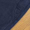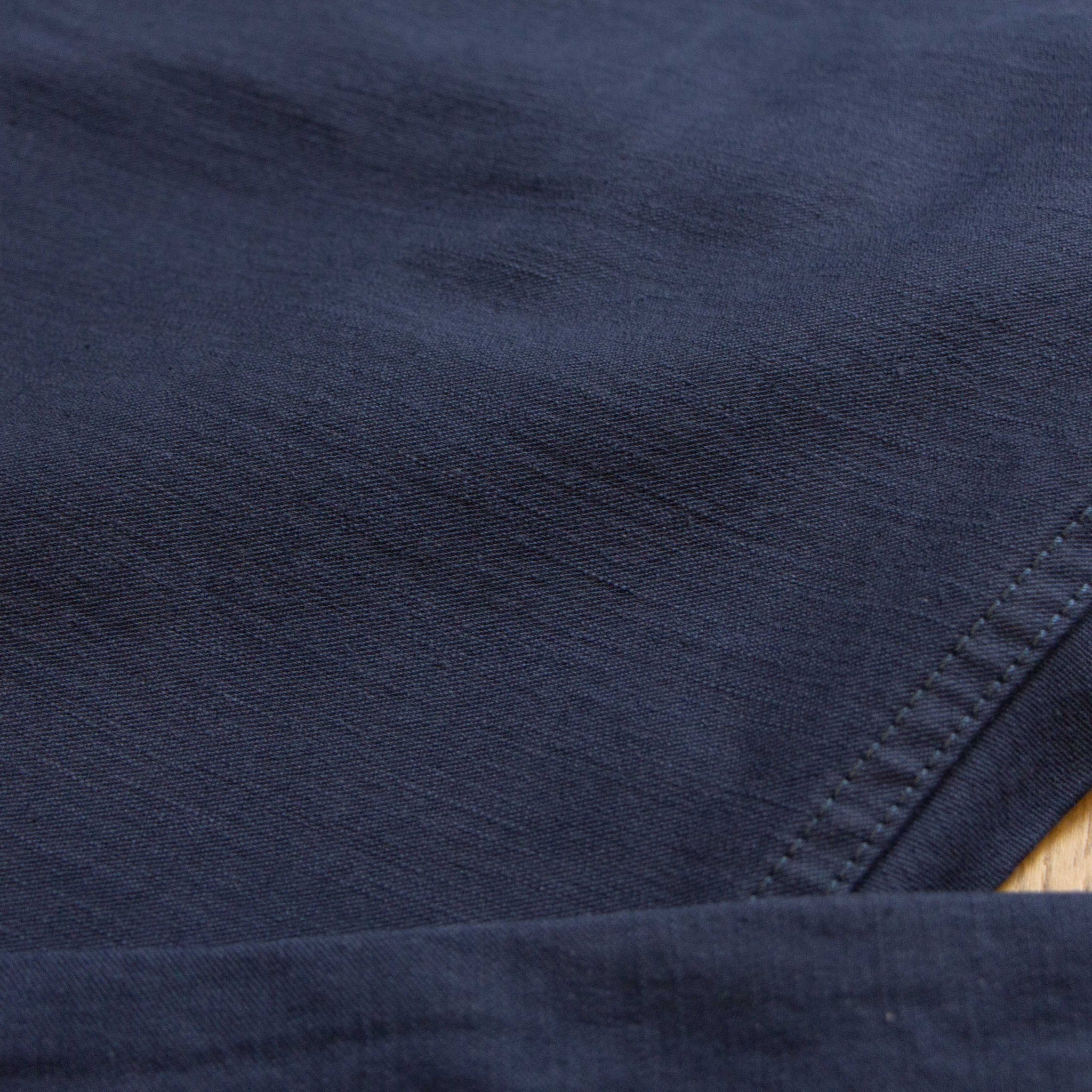 經紗以硫化染處理,緯紗則為黑色紗線,整體色調內斂沉穩,穿著感受自然舒適。布料使用不均勻紗線織成,讓表面呈現細微的橫向層次,再結合反面沙丁布 特有的霧面質感,形成簡約卻富有表情、帶有立體感的布料風貌。