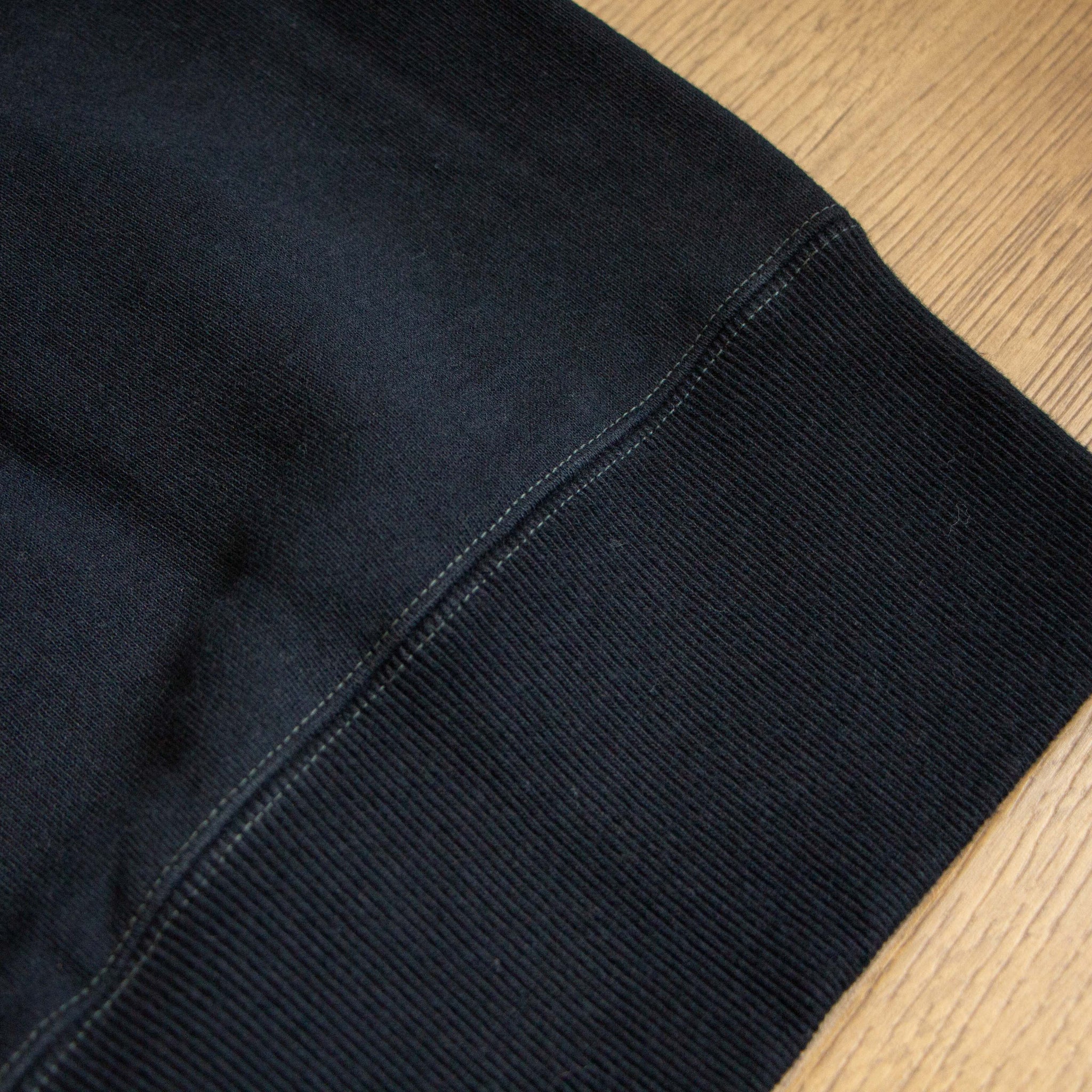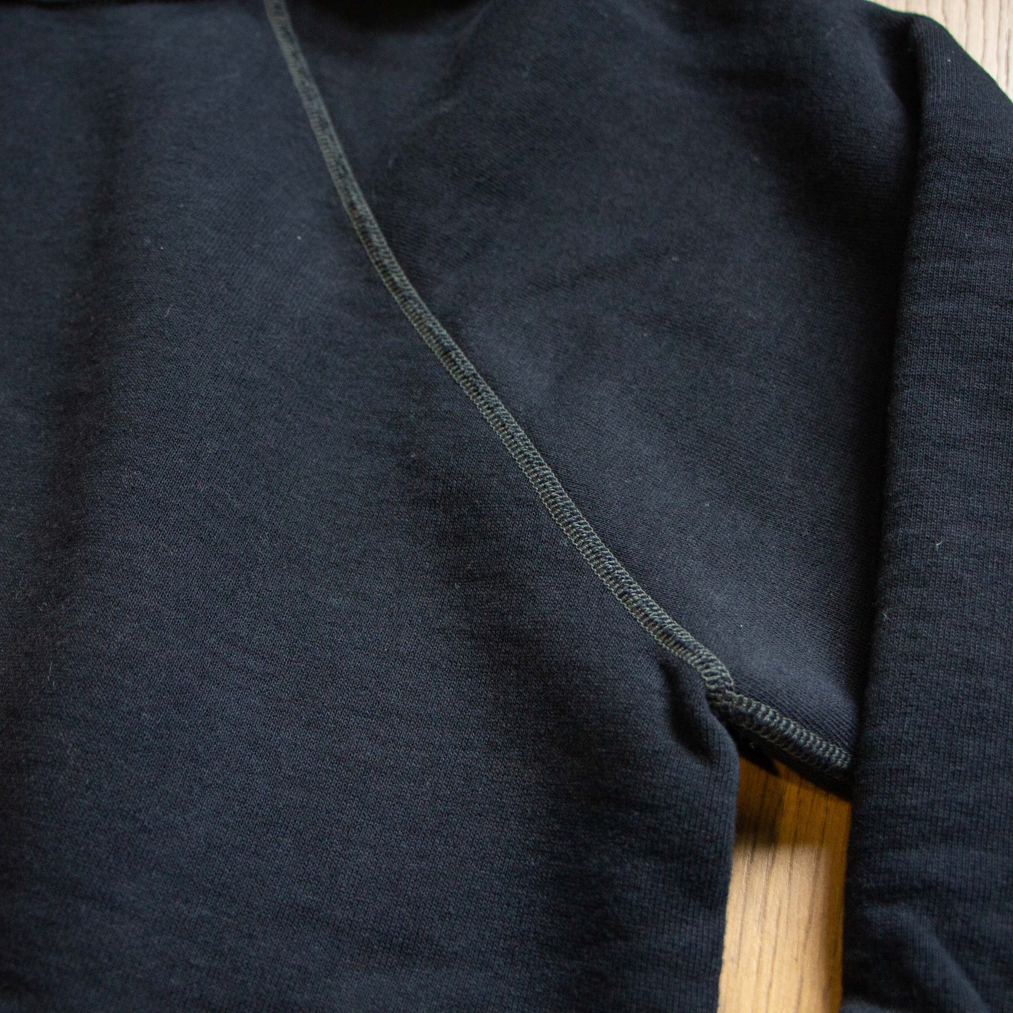 此款採用古著中常見、俗稱 「ドラポケ(Dora Pocket)」 的連帽設計,大型口袋帶來鮮明的復古風格與實用性。袖子、袖口與口袋皆以平縫機接合製作,而帽體與下擺羅紋則採 雙針縫製收邊完成,細節呈現扎實且講究。