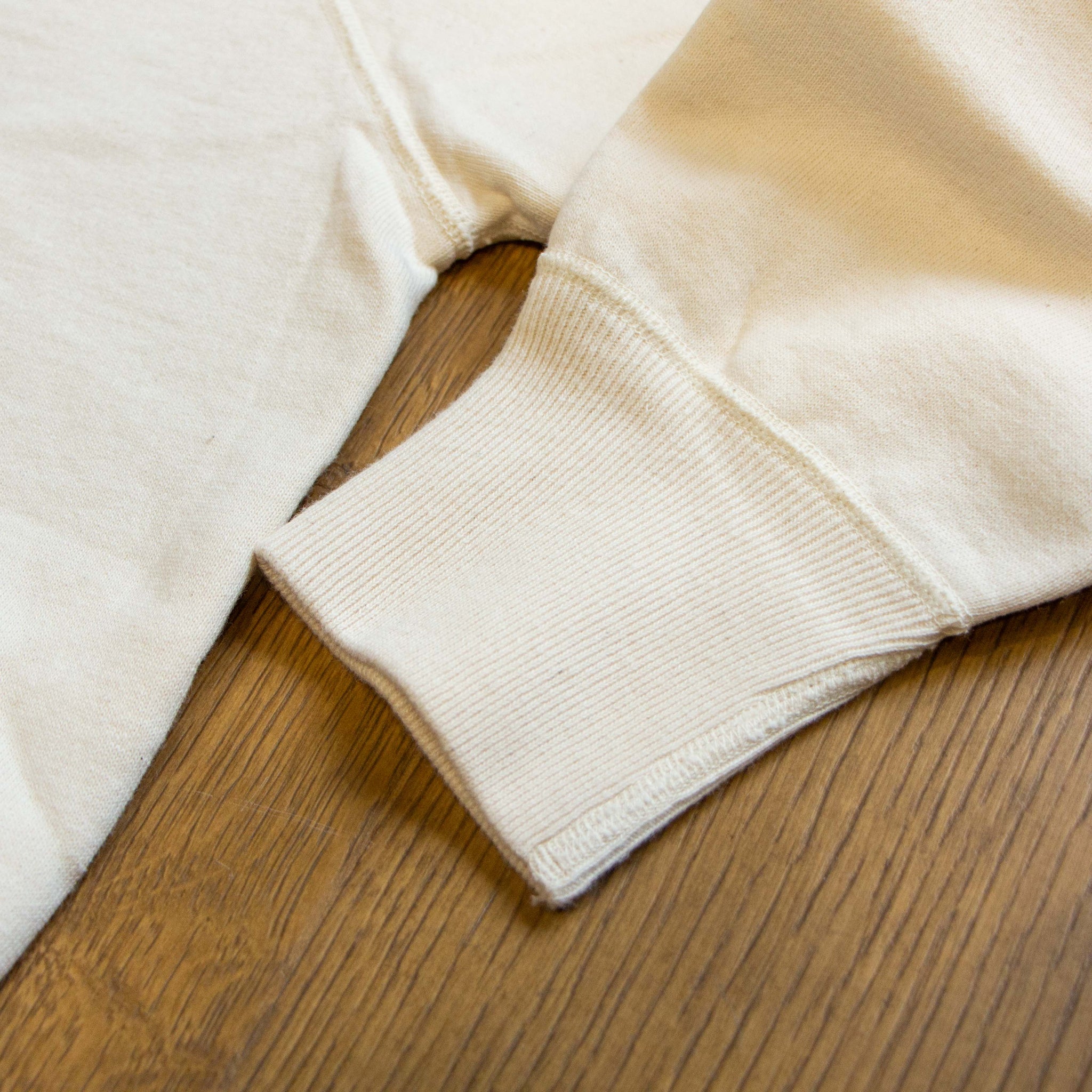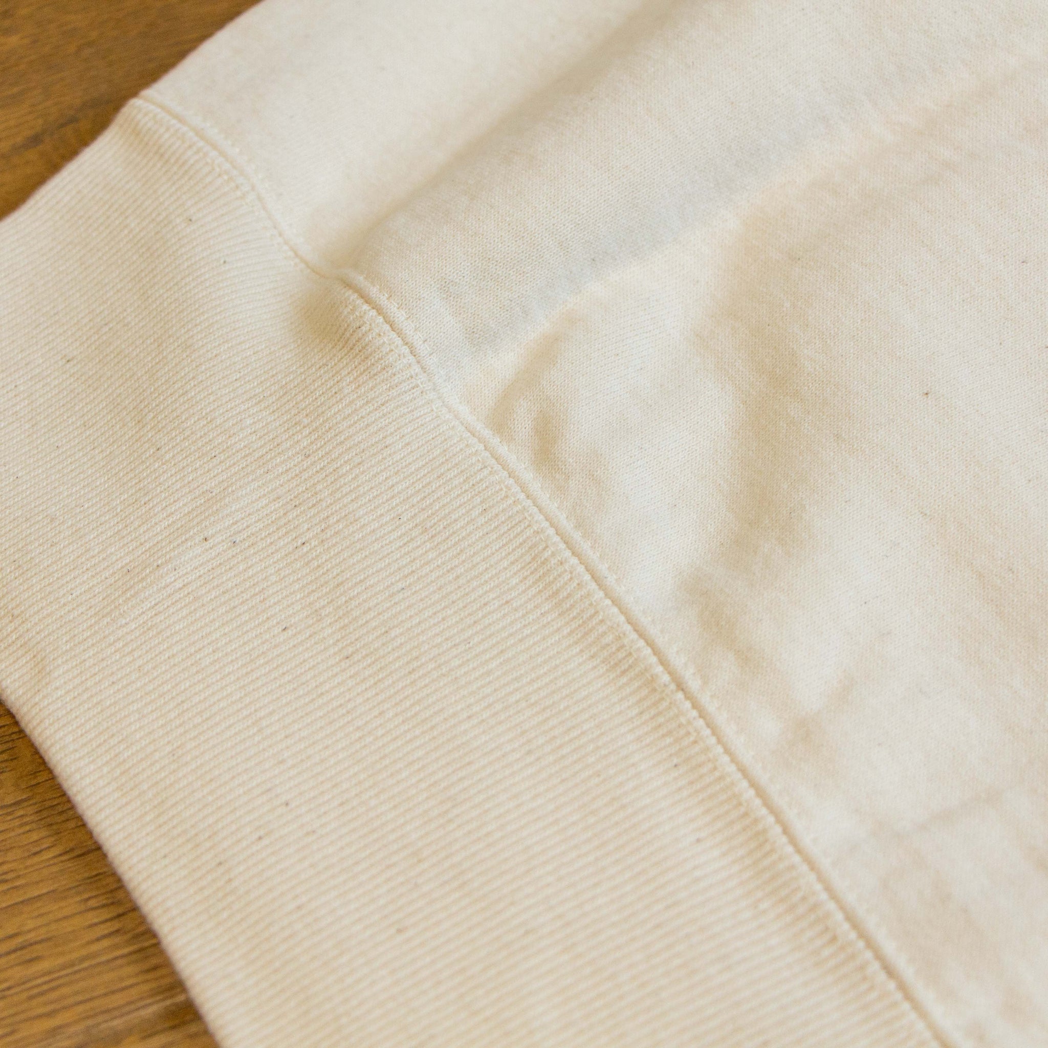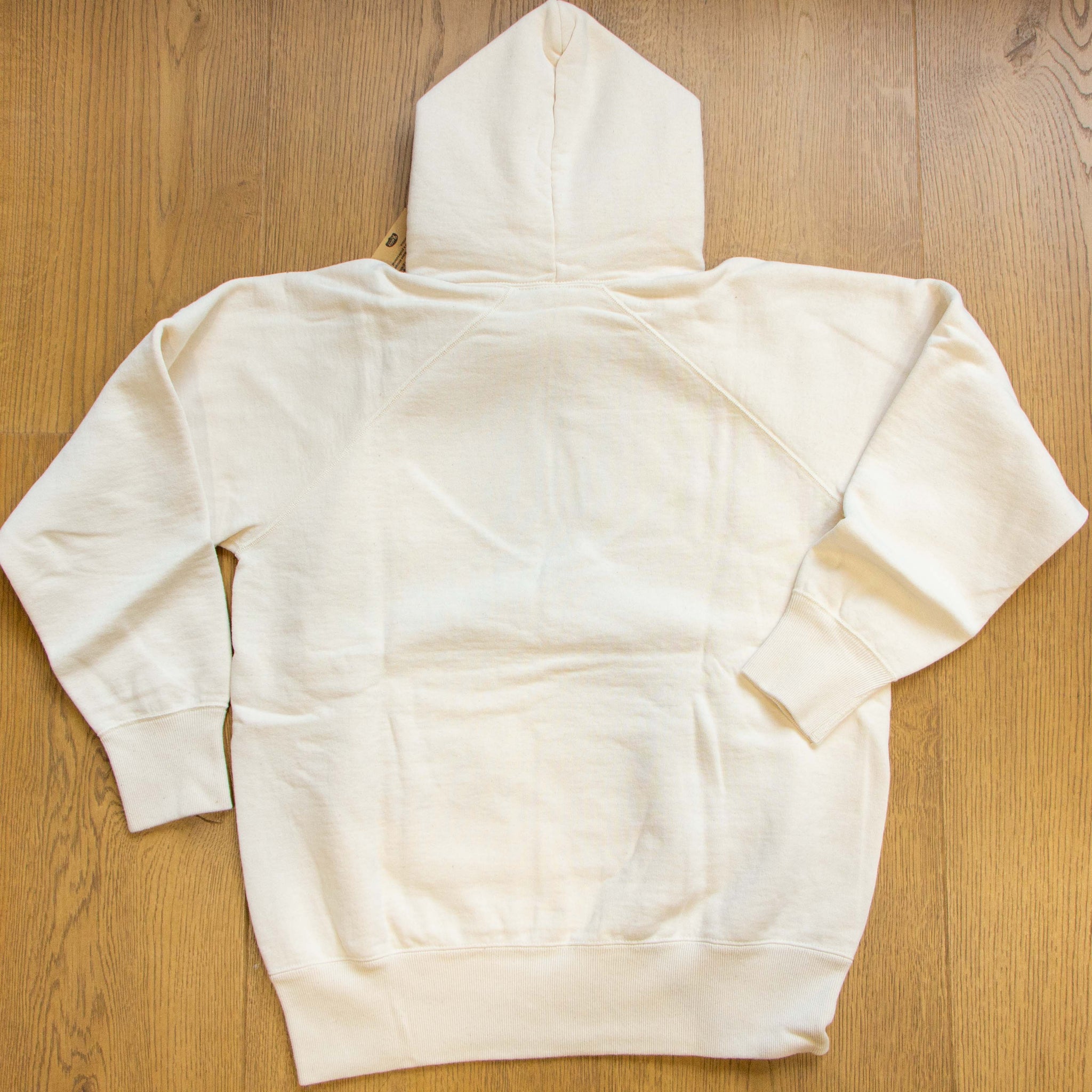 此款採用古著中常見、俗稱 「ドラポケ(Dora Pocket)」 的連帽設計,大型口袋帶來鮮明的復古風格與實用性。袖子、袖口與口袋皆以平縫機接合製作,而帽體與下擺羅紋則採 雙針縫製收邊完成,細節呈現扎實且講究。