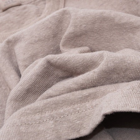 布面上偶爾可見不同顏色的纖維附著或混入,正是因為加入了 60% 回收棉所產生的自然結果,並非瑕疵。其紗線粗細約為 UES Ramayana T-shirt 的兩倍,整體手感紮實、有份量感。